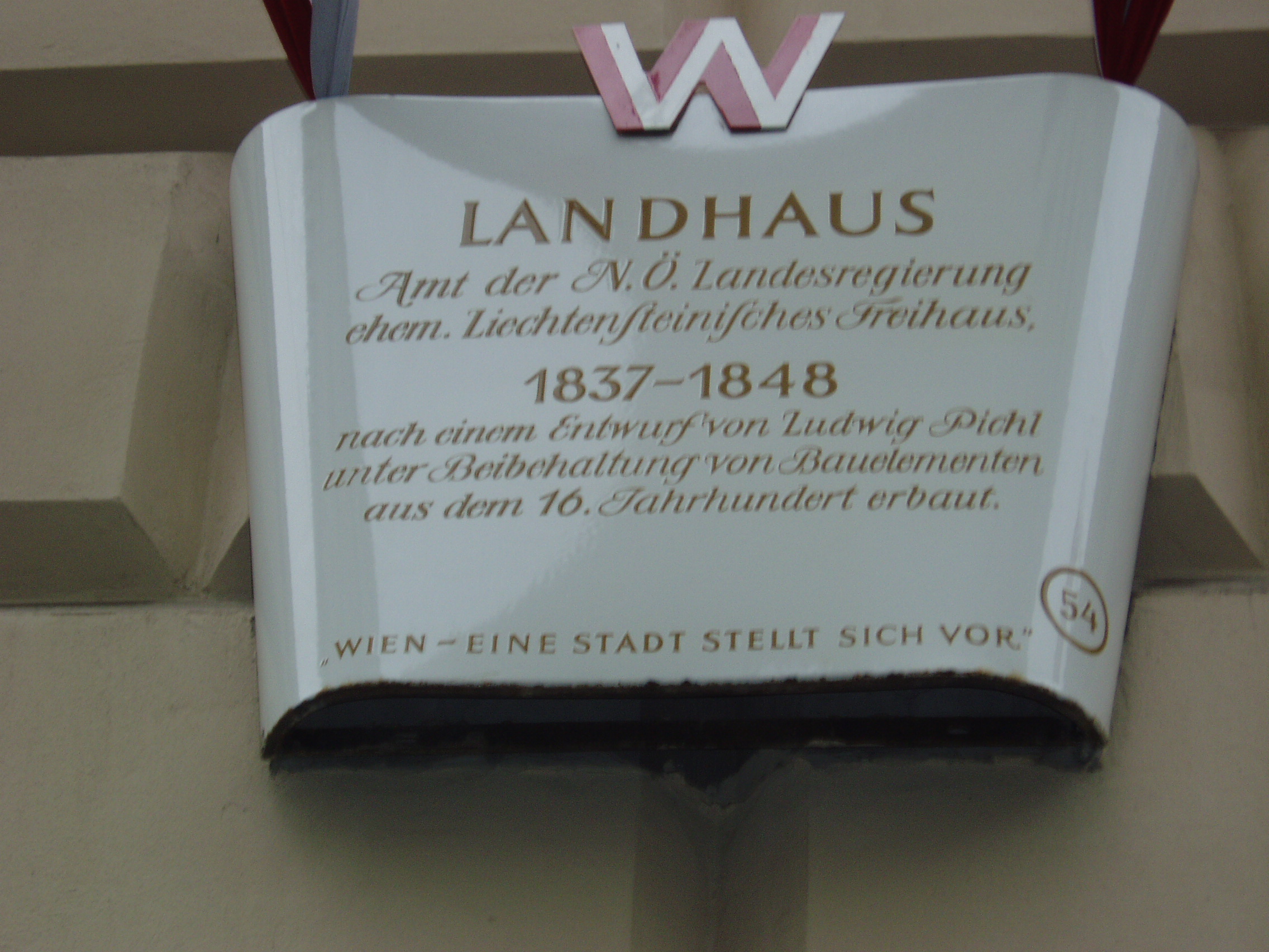 Nyilvános 1241 | 2821 | Herrengasse 13. Landhaus (a régi országház) műemléki táblája | A hatalmas palota építési ideje nem ismert, de az 1500-as években már állt. Azóta többször átépítették, jelenlegi klasszicista köntösét 1832-48 között kapta. Ebben a palotában ült össze évszázadokon keresztül, I. Miksa uralkodása óta az alsó-ausztriai rendi gyűlés. Ma az alsó-ausztriai kormány hivatala. Klasszicista Festsaal-ja (ünnepi terem) nevezetes hangversenyek színhelye volt. Falai között megfordult Schubert, Beethoven, s itt adta első bécsi koncertjét egy 12 éves magyar csodagyermek, Liszt Ferenc. |
