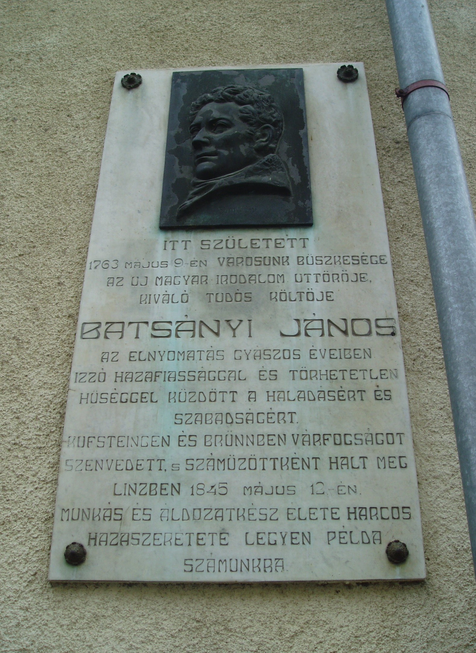 Nyilvános 882 | 1615 | Tapolca, Batsányi János utca 12. | A mostani ház helyén állt Batsányi János költő szülőháza. Az emléktáblát 1931-ben állították. Itt született a felvilágosodás neves költője 1763. május 9-én. Iskolai tanulmányit Tapolcán kezdte (lásd: Tapolca, Templom domb 8.), majd Keszthelyen, Veszprémben (lásd: Veszprém, Vár utca 8.) és Pesten folytatta. Kassán Kazinczy Ferenccel és Baróti Szabó Dáviddal kezdte szerkeszteni a Magyar Museum című folyóiratot. Ebben jelent meg 1789-ben híres verse, "A franciaországi változásokra", amelyben arra szólít fel, hogy "vigyázó szemetek Párizsra vessétek". Batsányi részt vett a Martinovics-féle összeesküvésében (vádiratát lásd: Tapolca, Templom domb 8.). Egy éves kufsteini várfogság után Bécsben hivatalnokként kereste kenyerét. 1805-ben vette feleségül az osztrák költőnőt, Baumberg Gabriellát. 1809-ben lefordította és kiegészítette Napóleon magyarokhoz intézett proklamációját. A Bécsből kivonuló francia csapatokkal Párizsba ment, ahol 1815-ben a Párizst megszálló osztrák katonaság elfogta. Spielberg várbörtönéből felesége közbenjárására kiszabadult, de Linzbe száműzték, ahova felesége is követte. Ott hunyt el 1845-ben. Hamvait - felesége hamvaival együtt - 1934-ben hazaszállították Tapolcára. Sírjuk az ún. Régi köztemetőben található, eredeti síremléküket a múzeumban (Templom domb 8.) helyezték el. A felvétel 2007 februárjában készült. Felh. irod.: Látnivalók Veszprém megyében. Miskolc, Well-PRess, 2000 Hangodi László: Múltbanéző - kiállításvezető a Tapolcai Városi Múzeum tárlataihoz. Tapolca, 2006 |