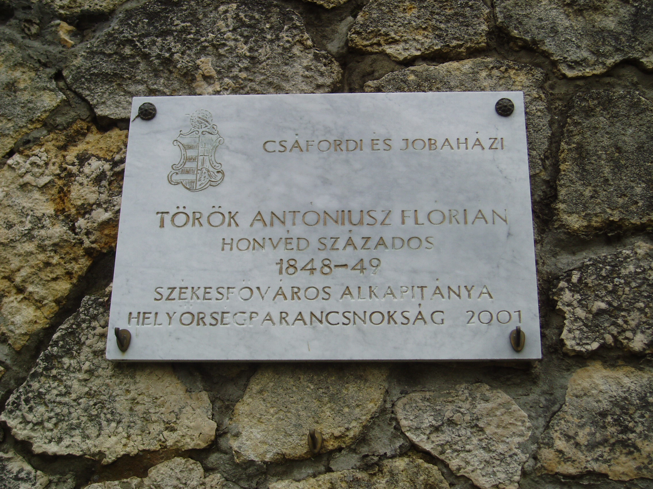 Nyilvános 860 | 1543 | Tapolca, Városi Panteonfal: Török Antóniusz Flórián emléktáblája | A Malom–tó mögött álló magas kőfal a Városi Panteonfal, amelyen több neves, tapolcai kötődésű személyiségnek állítottak emléktáblát. Török Antóniusz Flórián (1825-1878) 1848/49-ben honvéd százados volt. 2001-ben felavatott emléktáblája a testvére, Török János emlékét őrző tábla mellett látható. A felvétel 2007 februárjában készült. Felh. irod.: Bándi László: Emlékhelyek Veszprém megyében. Veszprém, 1996 www.tapolca.hu |