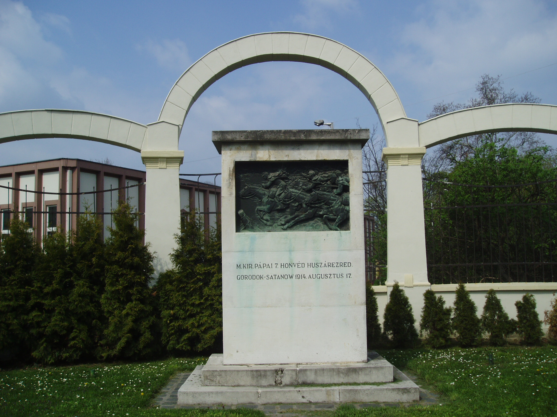 Nyilvános 909 | 1952 | Pápa, Esterházy út: a pápai 7-es huszárok emlékműve | Az Esterházy-kastély közelében, a színház irányában áll a pápai 7-es huszárezred emlékműve. Manno Miltiades domborműve az első világháború egyik hadvezetési baklövéseként bekövetkezett tragédiát idézi: az ezred elpusztult Galíciában. A fénykép 2007 áprilisában készült. Felh. irod.: Pápa. Szerk.: Sz. Farkas Aranka. Bp., Magyar Képek, 2000 |
