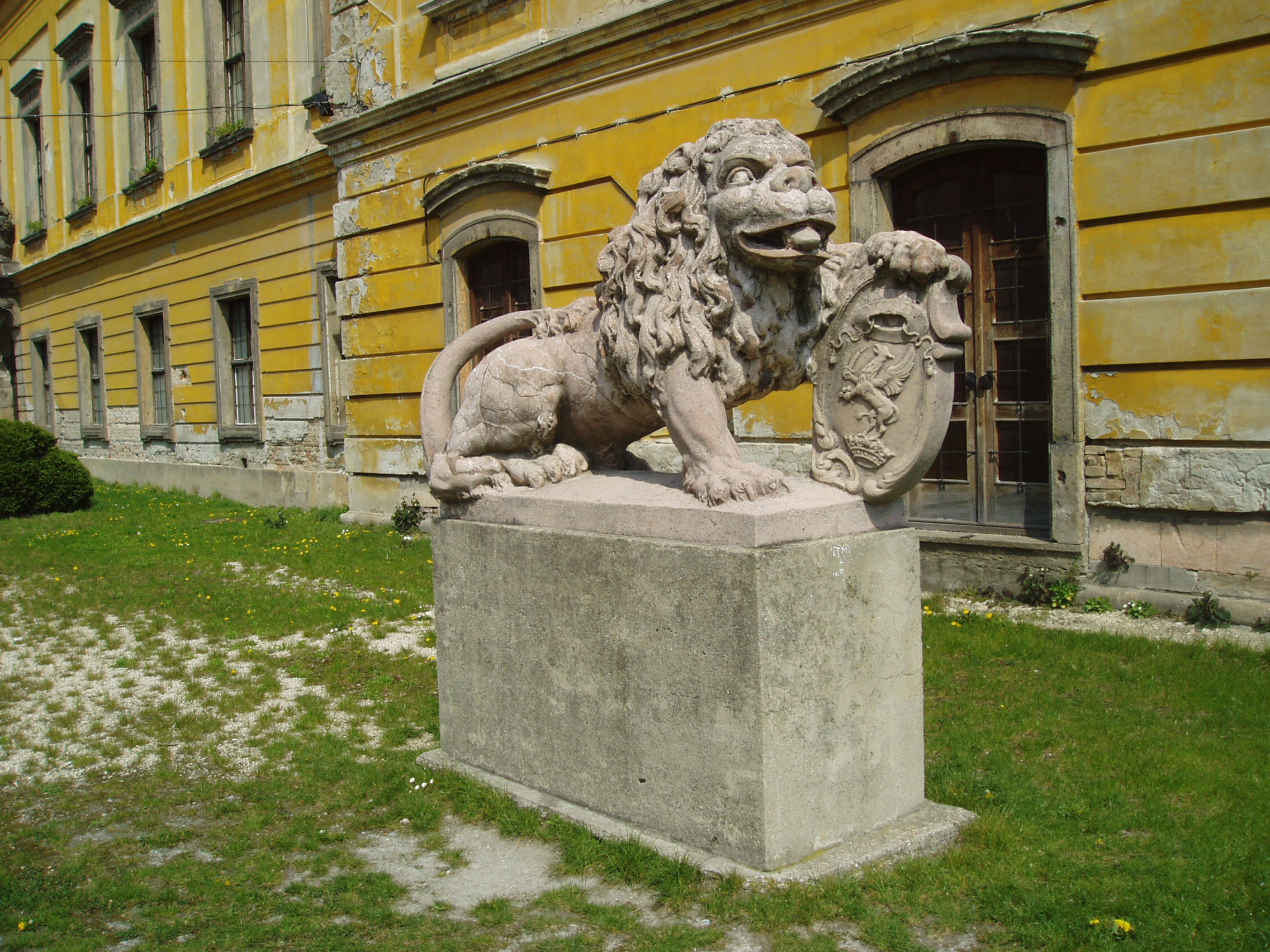 Nyilvános 927 | 1912 | Pápa, Fő tér 1-3. Esterházy-kastély | A barokk kastély a korábban itt állott végvár helyére épült, részben annak alapfalai, kövei felhasználásával. A régi várat az 1740-es évektől Esterházy Ferenc (1683–1754) tárnokmester kezdte átalakítani Franz Anton Pilgram tervei alapján. A barokk várkastély kialakítása 1784-re fejeződött be Esterházy Ferenc fia, Eszterházy Károly egri püspök idejében Fellner Jakab, majd Grossmann József vezetésével. Az U alakú, egyemeletes épület a versailles-i palota nyomán elterjedt francia kastélytípus képviselője. A képen a díszudvar bejáratánál elhelyezett két kőoroszlán egyike látható, amely az Esterházyak címerpajzsát tartja. Az oroszlánok 1945-ig a kastélyt övező kerítés díszes kovácsoltvas kapuját őrizték. A fénykép 2007 áprilisában készült. Felh. irod.: Németh Adél - Szabó Lajos: Pápa. Bp. Panoráma, 1989 Pápa. Szerk. Sz. Farkas Aranka. Bp., Magyar Képek, 2000 |
