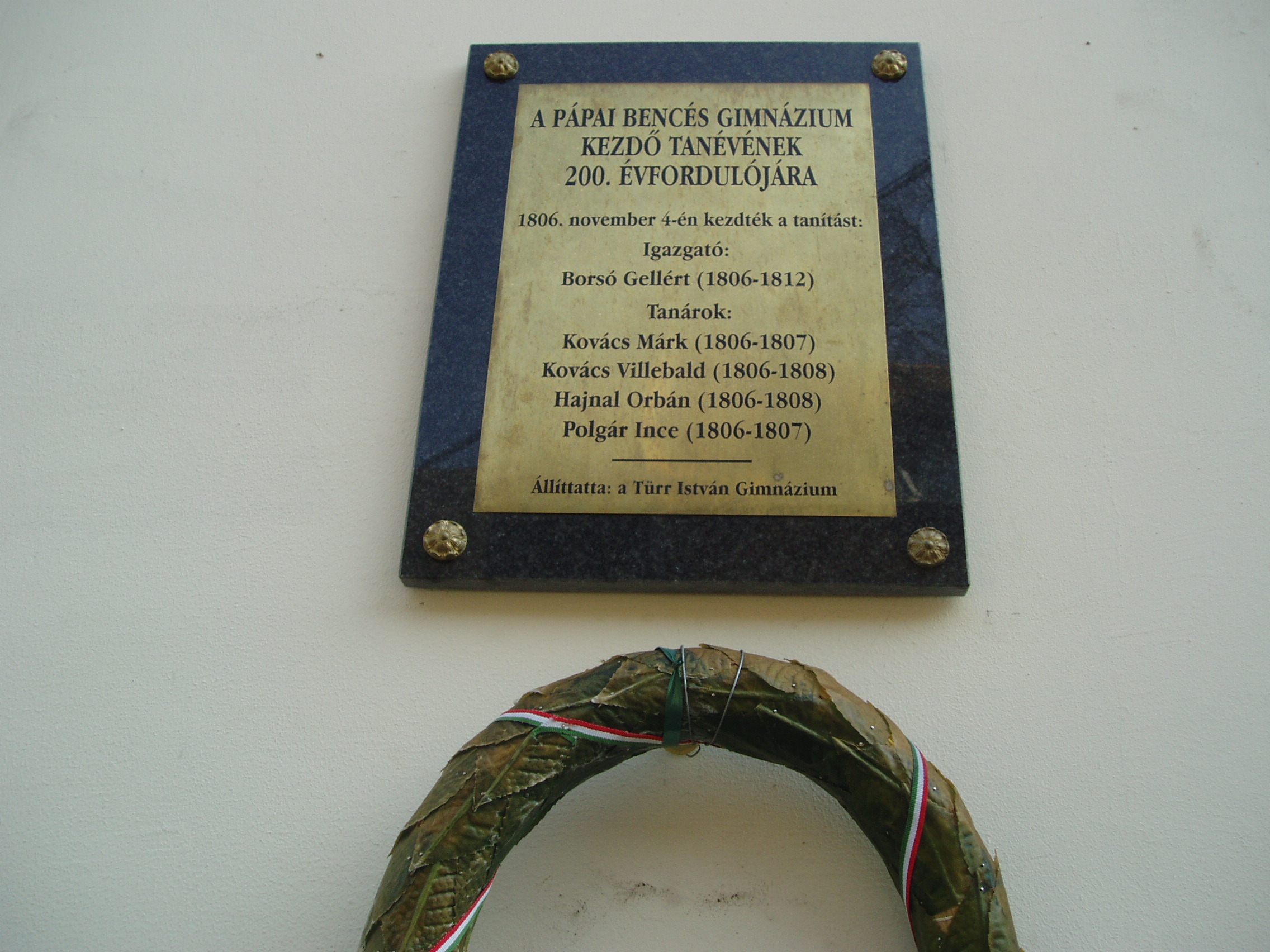 Nyilvános 854 | 1397 | Pápa, Fő utca 10. Bencés templom | Eredetileg a pálosok számára épült 1737-1742 között a korábban itt állott templom helyére. Építtetője, Acsády Ádám püspök szentelte fel. A pálos rend eltörlése után, 1806-ban kapták meg a bencések, akik ugyanebben az évben átvették és rendkívül magas szintre fejlesztették a pálosok korábbi iskoláját. A képen a bencés gimnázium 200. évfordulója alkalmából elhelyezett emléktábla látható az első tanári kar névsorával. A fénykép 2007 áprilisában készült. Felh. irod.: Németh Adél - Szabó Lajos: Pápa. Bp. Panoráma, 1989 |
