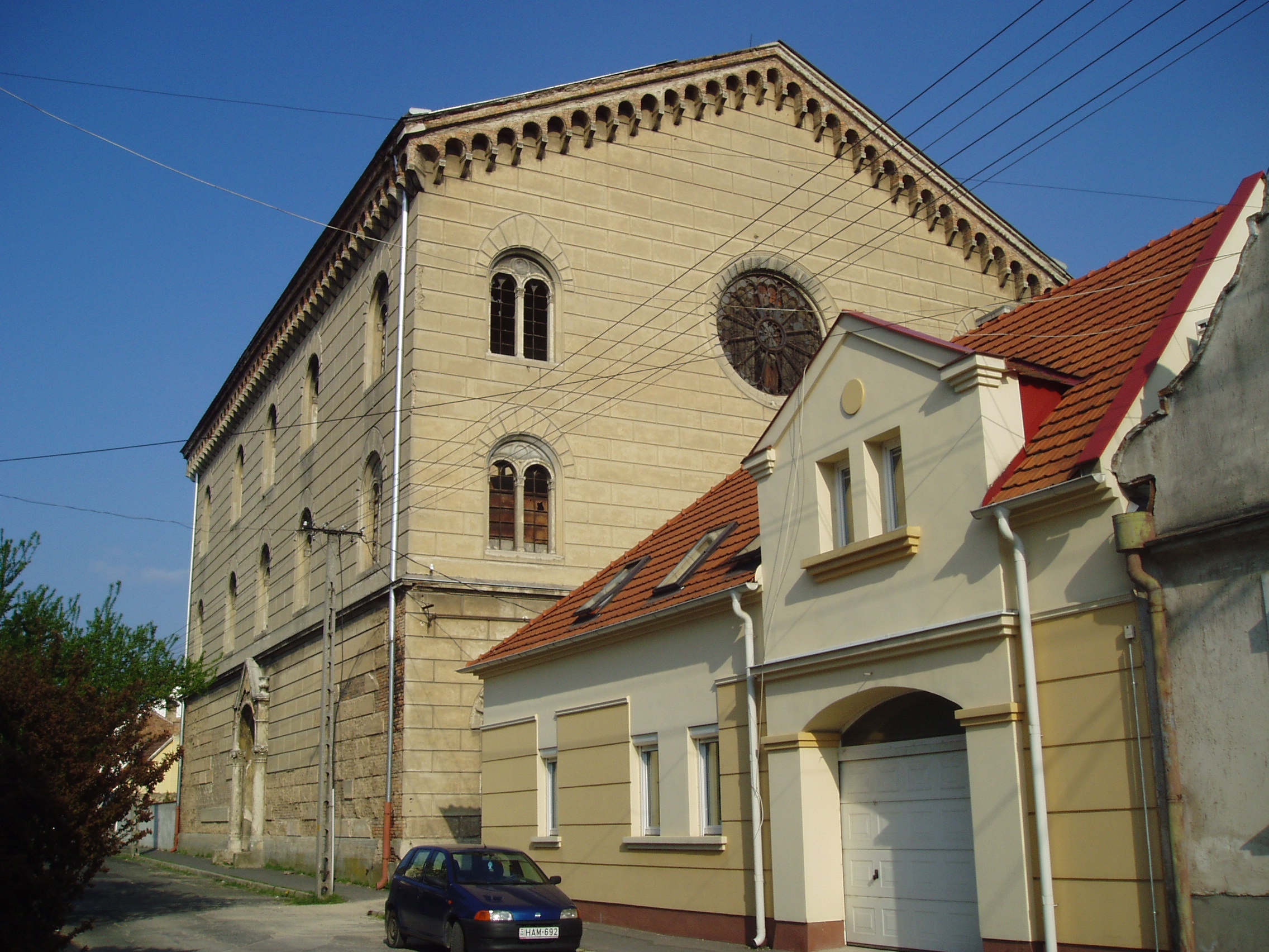 Nyilvános 926 | 2783 | Pápa, Petőfi utca 21. Zsinagóga | A napjainkig eredeti formában fennmaradt zsinagóga építését 1844-ben kezdték el. A 398 m2 alapterületű, közel 20 méter magas épületet Löw Lipót rabbi szentelte fel 1846-ban. A főbejárat a vallási előírásoknak megfelelően a nyugati oldalon található. A zsinagóga puritán külső megjelenését csak a félköríves fülkékbe helyezett romantikus ikerablakok és a klasszicizáló oldalkijárat díszíti. A kétszintes karzatszerkezettel rendelkező, dekoratívan festett belső térben nyolcszáz férfi számára volt ülőhely. Az épület jelenleg (2007) rendkívül elhanyagolt állapotban van, felújításra vár. A fénykép 2007 áprilisában készült. Felh. irod.: Németh Adél - Szabó Lajos: Pápa. Bp. Panoráma, 1989 www.papa.hu |