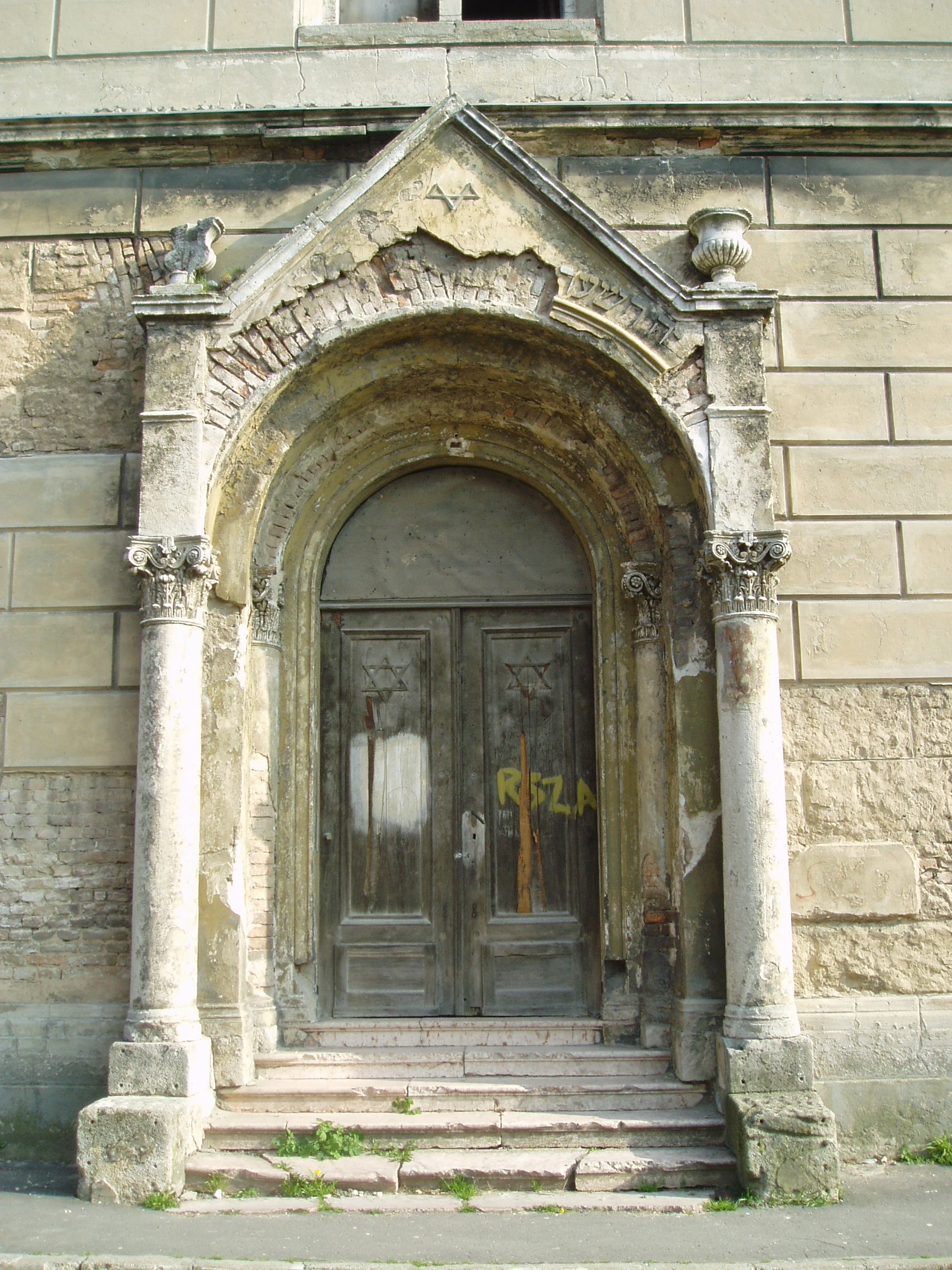 Nyilvános 897 | 1542 | Pápa, Petőfi utca 21. Zsinagóga | A napjainkig eredeti formában fennmaradt zsinagóga építését 1844-ben kezdték el. A 398 m2 alapterületű, közel 20 méter magas épületet Löw Lipót rabbi szentelte fel 1846-ban. A főbejárat a vallási előírásoknak megfelelően a nyugati oldalon található. A zsinagóga puritán külső megjelenését csak a félköríves fülkékbe helyezett romantikus ikerablakok és a klasszicizáló oldalkijárat díszíti. A kétszintes karzatszerkezettel rendelkező, dekoratívan festett belső térben nyolcszáz férfi számára volt ülőhely. Az épület jelenleg (2007) rendkívül elhanyagolt állapotban van, felújításra vár. A fénykép 2007 áprilisában készült. Felh. irod.: Németh Adél - Szabó Lajos: Pápa. Bp. Panoráma, 1989 www.papa.hu |