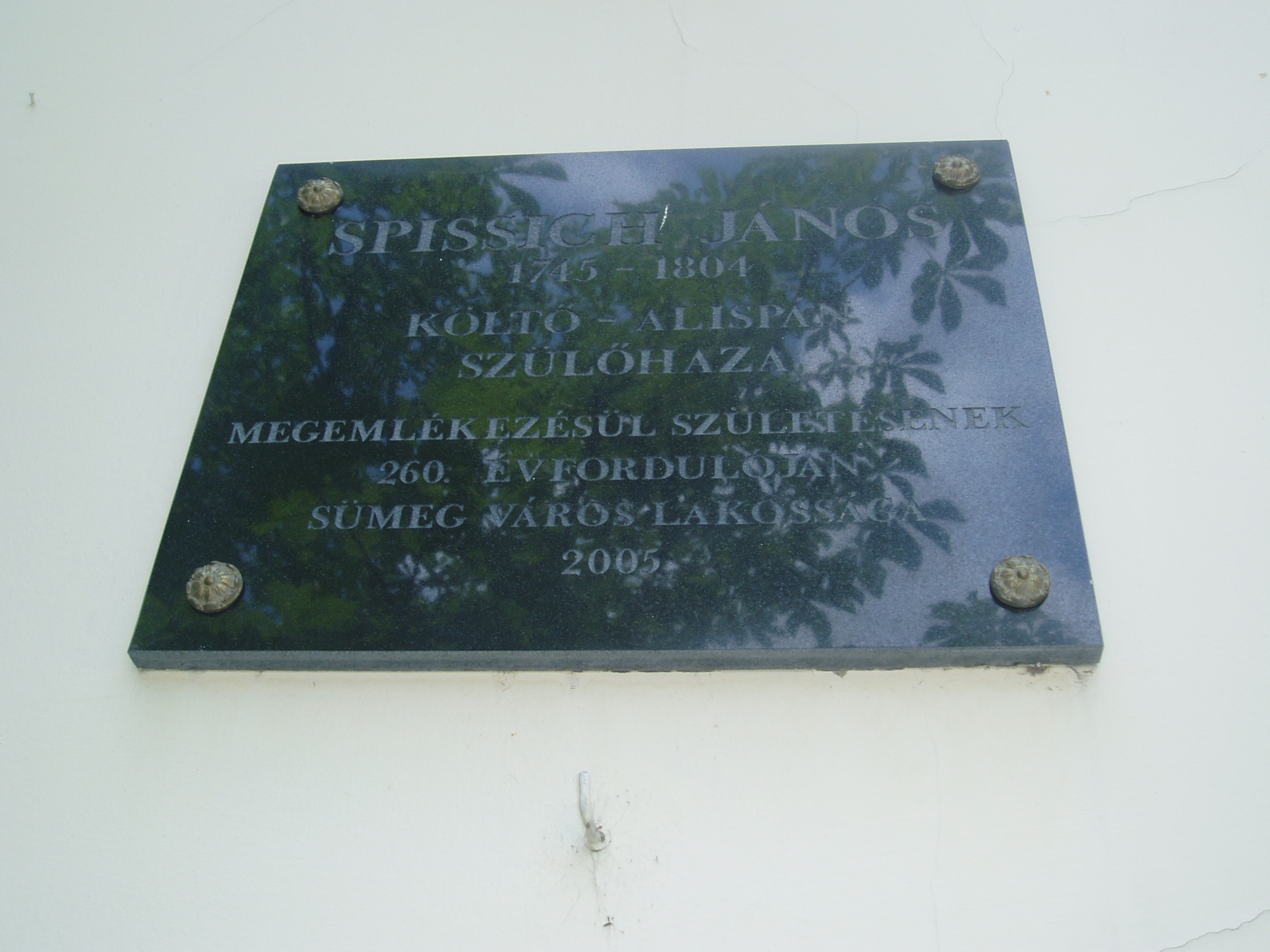 Nyilvános 856 | 1420 | Sümeg, Deák F. u. 6. | Mint a homlokzaton elhelyezett emléktáblán is olvasható, ebben a házban születetett 1745-ben Spissich János költő-alispán. Spissich János (Sümeg, 1745. márc. 28 – Kisgörbő, 1804. ápr. 25.) költő, alispán. Régi horvát nemesi családból származott. Apja Sopron megyei szolgabíró. 1761-ben Trencsében lépett a jezsuita rendbe, Kőszegen, Gyöngyösön, Komáromban tanított. 1771-ben megvált a rendtől, Zala vármegyében aljegyző, 1780-tól főjegyző. 1781-től az Eltz-uradalom (Szlavónia) jószágkormányzója, majd Zala megyei alispán, 1790–1791-ben országgyűlési követ. A francia forradalommal rokonszenvező ellenzéki magatartása miatt kegyvesztetté vált. József nádor vizsgálatot rendelt el ellene, de tisztázni tudta magát. 1797. ápr. 12-i zalai megyegyűlés elmozdította az alispánságból, 1798-tól kisgörbői birtokán élt. Szabadkőműves, a zalaegerszegi nagypáholy vezetője. Baráti viszonyban volt Kazinczyval, Pálóczi Horváthtal. Jelen volt Széchényi Ferencnél tartott ülésen, amelyen a tudós társaság felállítását tervezték. Versei közül A jövendő századnak c. emelkedik ki. Beszélt a magyaron kívül olasz, német, latin, szláv és orosz nyelven. A fénykép 2007 júniusában készült. Felh. irod.: Veszprém megyei életrajzi lexikon. Veszprém, 1998 |