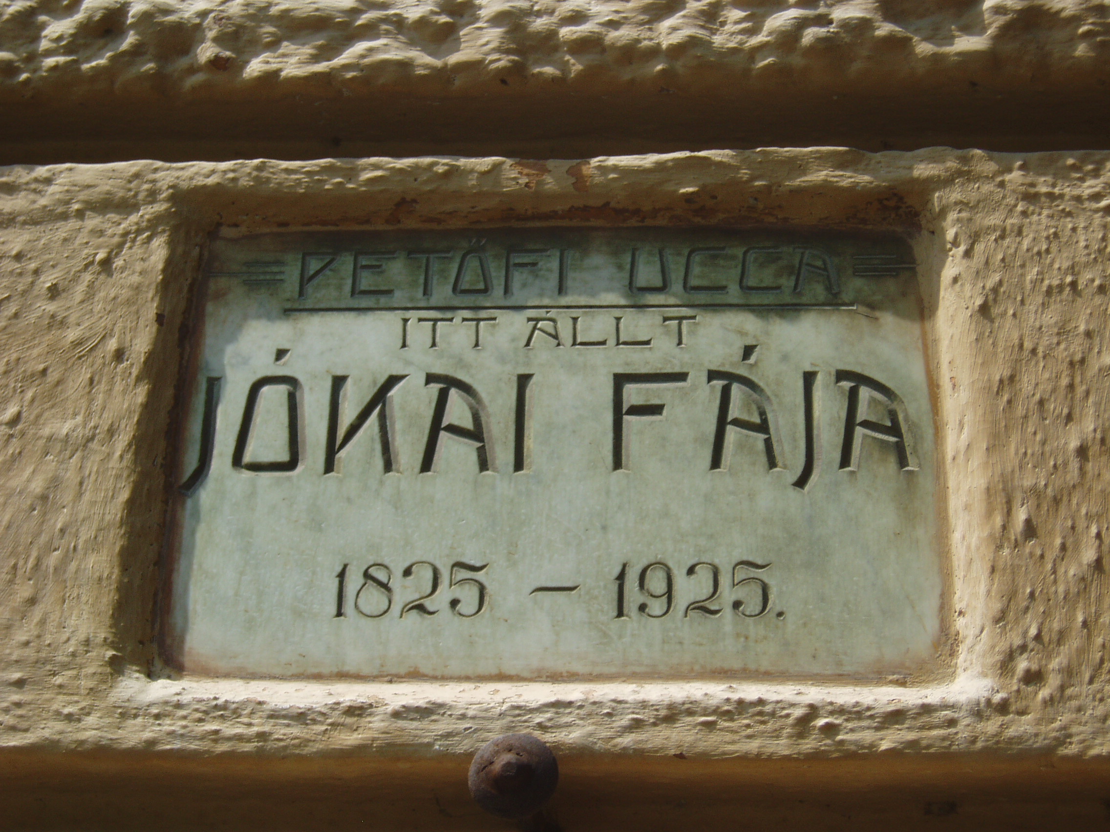 Nyilvános 851 | 1750 | Sümeg, Kossuth utca 13. | A Kisfaludy szálló épületén a következő rejtélyes emléktábla olvasható: "Petőfi ucca. Itt állt Jókai fája 1825-1925". A források szerint Jókai 1857 nyarán járt Sümegen egy nagyobb kirándulás keretében. Füreden szállt meg, majd Tihanyba és Keszthelyre látogatott. Bejárta és lerajzolta a Balaton-felvidéki várromokat, Sümegen felkereste Kisfaludy Sándor sírját. Minderről be is számol a Magyar hon szépségei című könyvében. De hogy az egykor itt állott fa milyen történetet takar, annak eddig nem jutottam nyomára. A fénykép 2007 júniusában készült. |