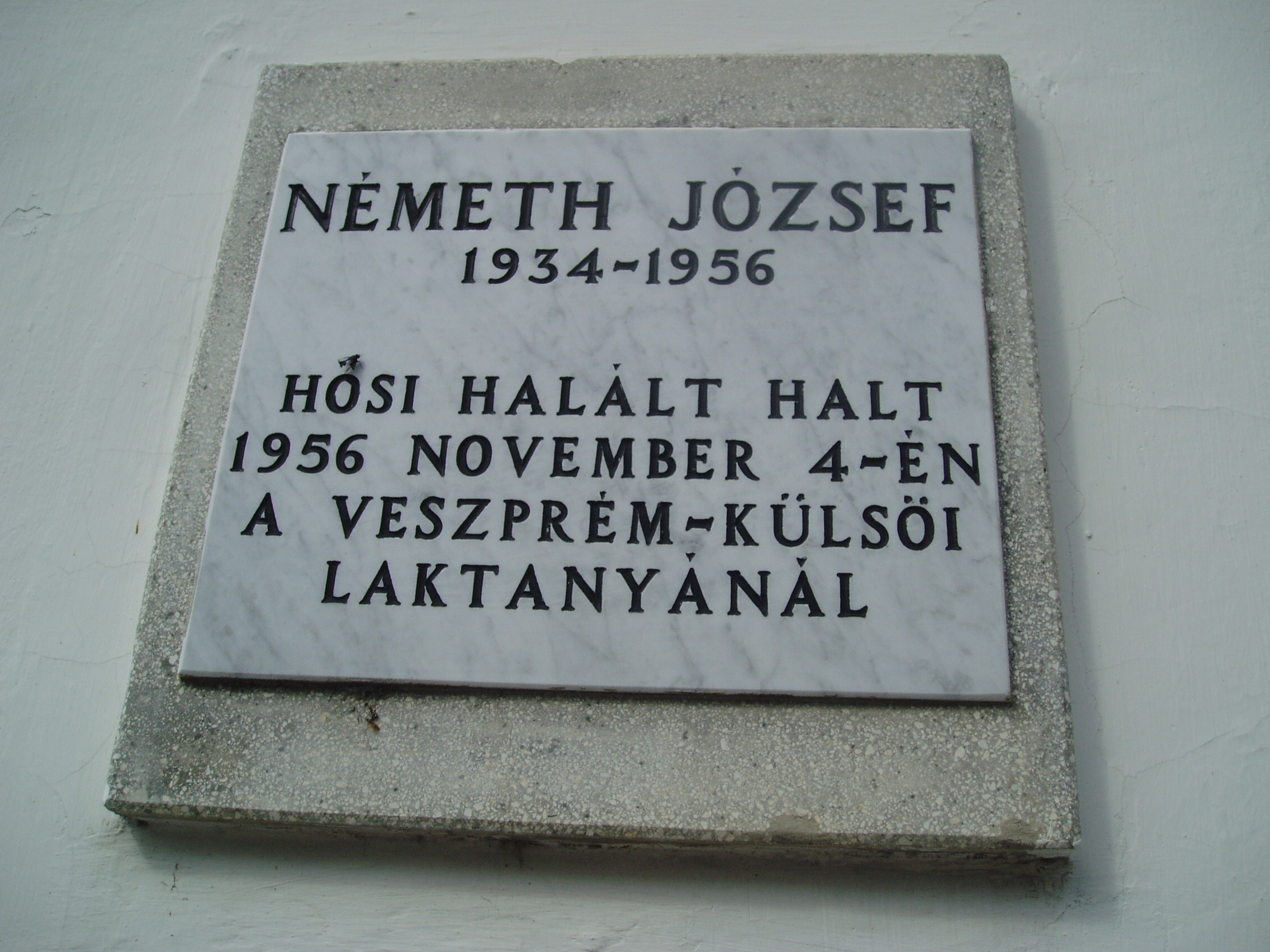 Nyilvános 850 | 1467 | Sümeg, Panteonfal. Németh József emléktáblája | A Kisfaludy téren, Kisfaludy Sándor szülőháza előtt alakították ki Sümeg Panteonfalát. A képen Németh József (1934-1956) emléktáblája látható. Felirata szerint hősi halált halt 1956. november 4-én a Veszprém-külsői laktanyánál (a Veszprém megyei életrajzi lexikon nem említi). A fénykép 2007 júniusában készült. Felh. irod.: Koppány Tibor - Kozák Károly: Sümeg útikalauz. Veszprém, Idegenforgalmi Hivatal, 1965 Látnivalók Veszprém megyében. Miskolc, Well-PRess, 2004 |