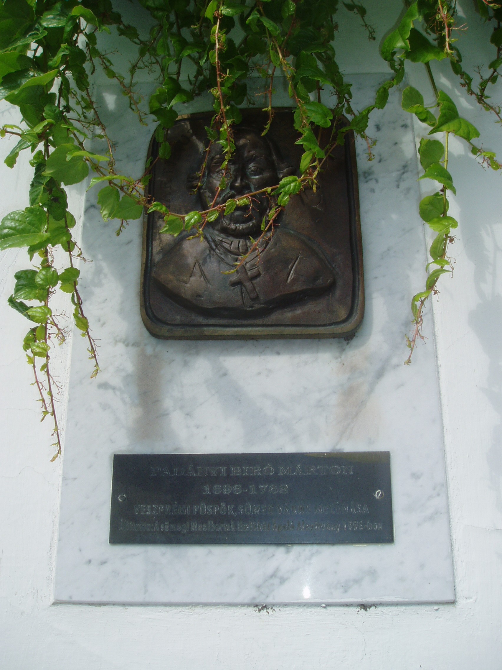 Nyilvános 861 | 1333 | Sümeg, Panteonfal. Padányi Bíró Márton emléktáblája | A Kisfaludy téren, Kisfaludy Sándor szülőháza előtt alakították ki Sümeg Panteonfalát. A képen Padányi Bíró Márton emléktáblája látható, Máger Ágnes alkotása (1996). Felirata: PADÁNYI BIRÓ MÁRTON, 1696-1762, veszprémi püspök, Sümeg város mecénása Padányi Bíró Márton (Padány, 1696. ápr. 15. – Sümeg, 1762. aug. 10.) író, püspök, főispán. 1729-ben nevezték ki veszprémi kanonokká és felsőörsi préposttá. 1745. márciusától a veszprémi egyházmegye püspöke és a megye főispánja. A káptalannal és a várossal sokat hadakozott, ezért szívesebben tartózkodott Sümegen, ahol megépíttette a ma is álló püspöki palotát (lásd: Sümeg, Szent István tér 10.) és a plébániatemplomot (lásd: Sümeg, Bíró M. u. 1.). Püspöki tevékenységét az egyházmegye látogatásával kezdte, amelynek anyaga 10 hatalmas kötetet tesz ki. Templomok, és iskolák tucatjait építtette vagy állíttatta helyre, amelyeknek jelentős részét a protestánsoktól, nem egy esetben erőszakos, hatalmi eszközökkel szerezte vissza. Az államhatalomnak az eretnekekkel szembeni kötelességeit fejtette ki az Enchiridion de fide c. munkájában, amely 1750-ben jelent meg. A könyv, vallási türelmetlensége miatt nagy vihart kavart, nemzetközi tiltakozásra a királynő elkoboztatta. Nagyvonalúan támogatott írókat műveik kiadásában, művészeket az alkotásban. Maga is sokat írt. Sümegen a plébániatemplom előtt áll bronz mellszobra, Marton László alkotása. A veszprémi székesegyház altemplomában nyugszik. A fénykép 2007 júniusában készült. Felh. irod.: Koppány Tibor - Kozák Károly: Sümeg útikalauz. Veszprém, Idegenforgalmi Hivatal, 1965 Látnivalók Veszprém megyében. Miskolc, Well-PRess, 2004 Veszprém megyei életrajzi lexikon. Veszprém, Veszprém Megyei Önkormányzat Közgyűlése, 1998 www.ekmk.hu/emlekhely/Emlekhelyek.html |