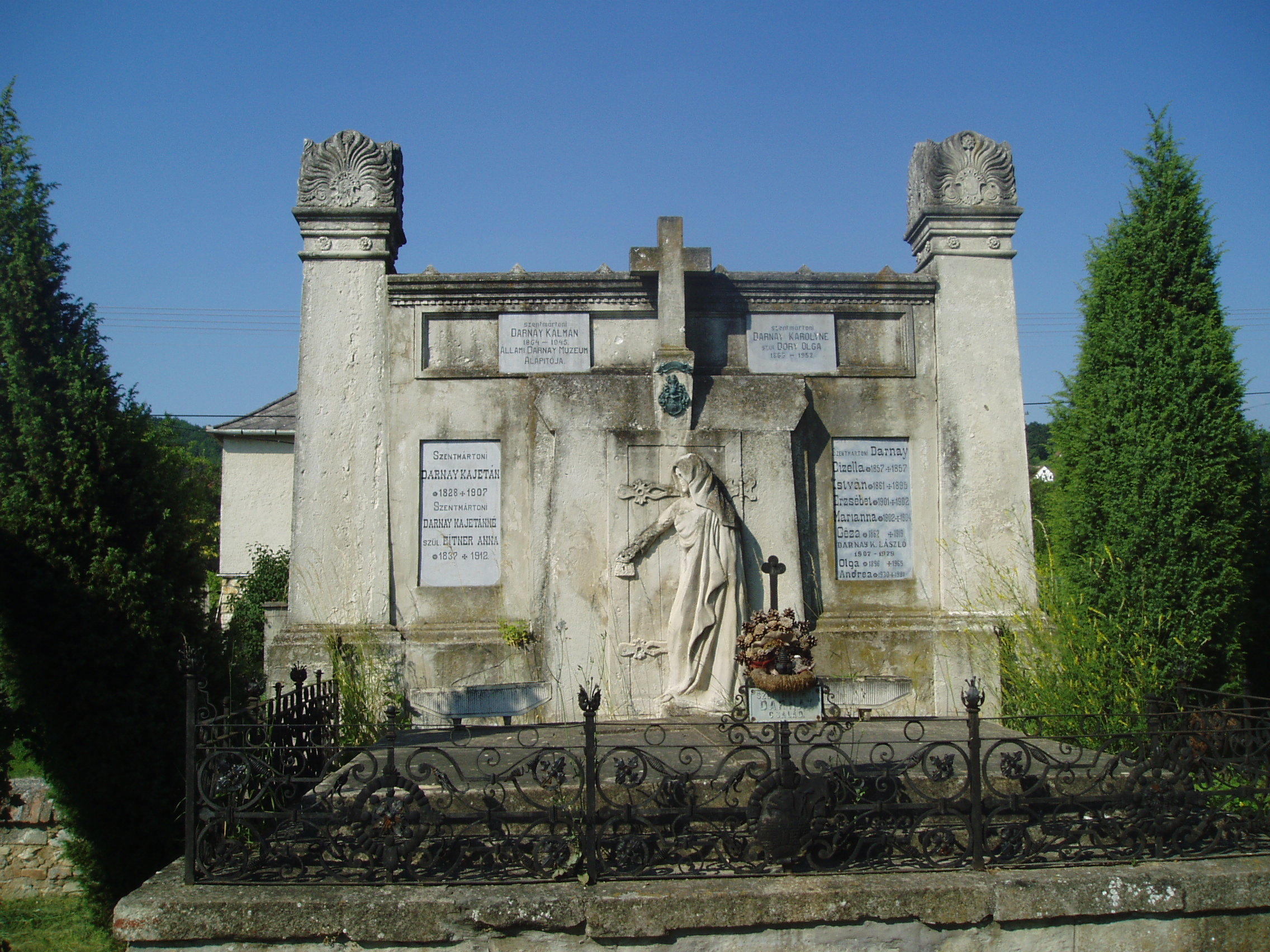 Nyilvános 896 | 2462 | Sümeg, Temető. Darnay Kálmán sírja | Sümeg délkeleti határában, a Tapolcára vezető út mellett emelkedő lankás domboldalon találjuk a város köztemetőjét. Helyét még Bíró Márton püspök jelölte ki; jelentősebb számban a XIX. század eleje óta kezdtek ide temetkezni. A temetődomb tetején áll az 1816-ban épített, későbarokk stílusú temetőkápolna. Körülötte a sümegi élet utolsó két évszázada szinte valamennyi híres személyiségének sírja fellelhető. Magas kőalapra épített, díszes kovácsoltvassal kerített sírkert a szentmártoni Darnay család temetkezési helye. Itt nyugszik Darnay Kálmán (1864-1945) múzeumalapító, régész, író, aki hosszú évtizedeken át Sümeg társadalmi és kulturális életének egyik legjelentősebb képviselője volt. Darnayt sokat foglalkoztatta Kisfaludy Sándor élete. Közreműködött levelezése kiadásában, múzeumában gazdag gyűjteményt hozott össze a költőre vonatkozó dokumentumokból. 1897-ben a Nemzeti Múzeumnak ajándékozta Kisfaludy Sándor 3600 kötetes könyvtárát. Két regényének is a költő élete a témája (Testőrszerelmek, Elkésett csók). A bujdosó gyöngysor c. munkájában a Balaton- és a Bakony-vidéki várak történetének regényes feldolgozását, a Kaszinózó táblabírákban pedig szülőföldje anekdotáit gyűjtötte csokorba. A család síremlékét Istók János szobrászművész készítette. Az ő alkotása a nőalakot ábrázoló dombormű is. A fénykép 2007 júniusában készült. Felh. irod.: Koppány Tibor - Kozák Károly: Sümeg útikalauz. Veszprém, Idegenforgalmi Hivatal, 1965 Sümegi kalauz. Sümeg, Sümegi Fórum Alapítvány, 1993 Miklósi-Sikes Csaba: Kőbe vésett történelem. A sümegi városi temetők története és sírjelei 1950-ig. Sümeg, Sümegi Fórum Alapítvány, 2002 Veszprém megyei életrajzi lexikon. Veszprém, Veszprém Megyei Önkormányzat Közgyűlése, 1998 |