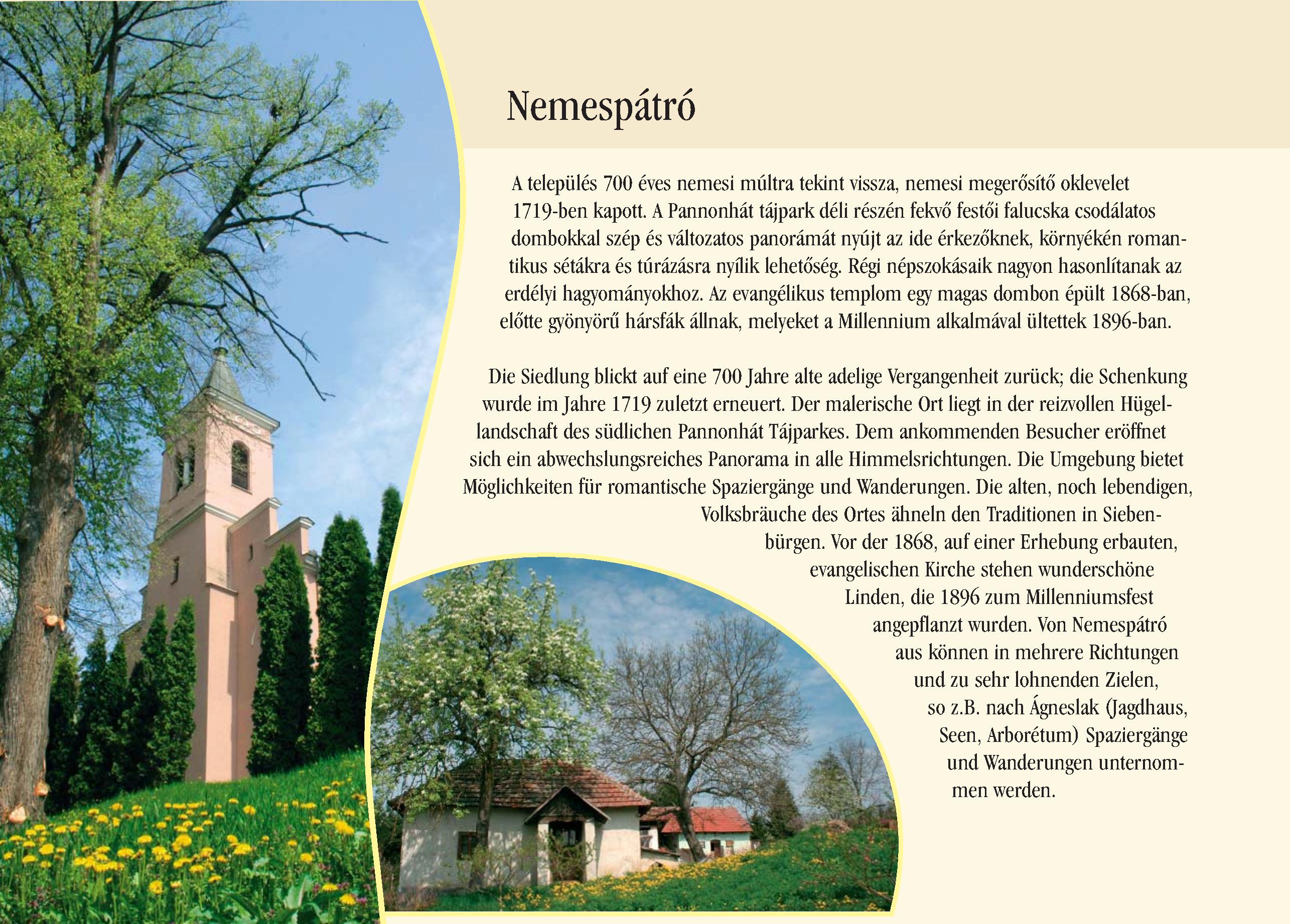 Nyilvános 1879 | 7943 | Nemespátró | Die Siedlung blickt auf eine 700 Jahre alte adelige Vergangenheit zurück; die Schenkung wurde im Jahre 1719 zuletzt erneuert. Der malerische Ort liegt in der reizvollen Hügel-landschaft des südlichen Pannonhát Tájparkes. Dem ankommenden Besucher eröffnet sich ein abwechslungsreiches Panorama in alle Himmelsrichtungen. Die Umgebung bietet Möglichkeiten für romantische Spaziergänge und Wanderungen. Die alten, noch lebendigen, Volksbräuche des Ortes ähneln den Traditionen in Siebenbürgen. Vor der 1868, auf einer Erhebung erbauten, evangelischen Kirche stehen wunderschöne Linden, die 1896 zum Millenniumsfest angepflanzt wurden. Von Nemespátró aus können in mehrere Richtungen und zu sehr lohnenden Zielen, so z.B. nach Ágneslak (Jagdhaus, Seen, Arborétum) Spaziergänge und Wanderungen unternommen werden. Dieses Text stammt von: Pannonhát tájpark prospektus 2006. Web: http://www.pannonhat.hu/ (auch in Deutsch) |