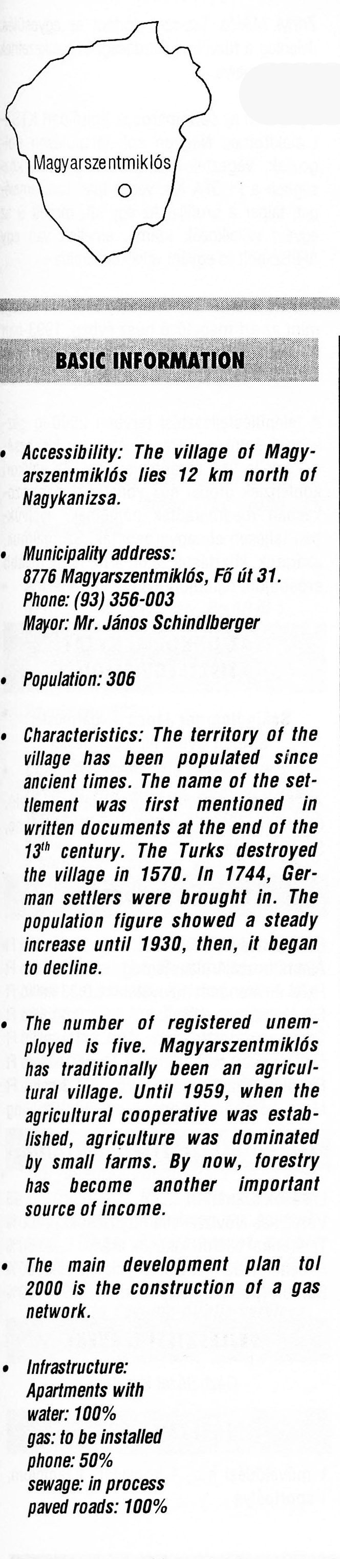Nyilvános 2201 | 5983 | Magyarszentmiklós | BASIC INFORMATION Accessibility: The village of Magyarszentmiklós lies 12 km north of Nagykanizsa. Municipality address: 8776 Magyarszentmiklós, Fő út 31. Phone: (93) 356-003 Mayor: Mr. János Schindlberger Population: 306 Characteristics: The territory of the village has been populated since ancient times. The name of the settlement was first mentioned in written documents at the end of the 13th century. The Turks destroyed the village in 1570. In 1744, German settlers were brought in. The population figure showed a steady increase until 1930, then, it began to decline. The number of registered unemployed is five. Magyarszentmiklós has traditionally been an agricultural village. Until 1959, when the agricultural cooperative was established, agriculture was dominated by small farms. By now, forestry has become another important source of income. The main development plan tol 2000 is the construction of a gas network. Infrastructure: Apartments with water: 100% gas: to be installed phone: 50% sewage: in process paved roads: 100% This text came from the following book: Title: Handbook of Zala county (Zala megye kézikönyve) Series: County handbooks of Hungary (Magyarország megyei kézikönyvei) Chief editor: Hóbor József Publisher: (Hatvan), CEBA-Hungary Ltd, 1998 ETO: 908.439.121(035) ; 050.8(439.121) ISBN: 963-9089-18-2 Pages: 488-1040 p. Remark: Closed on: 1998. márc. 31. |
