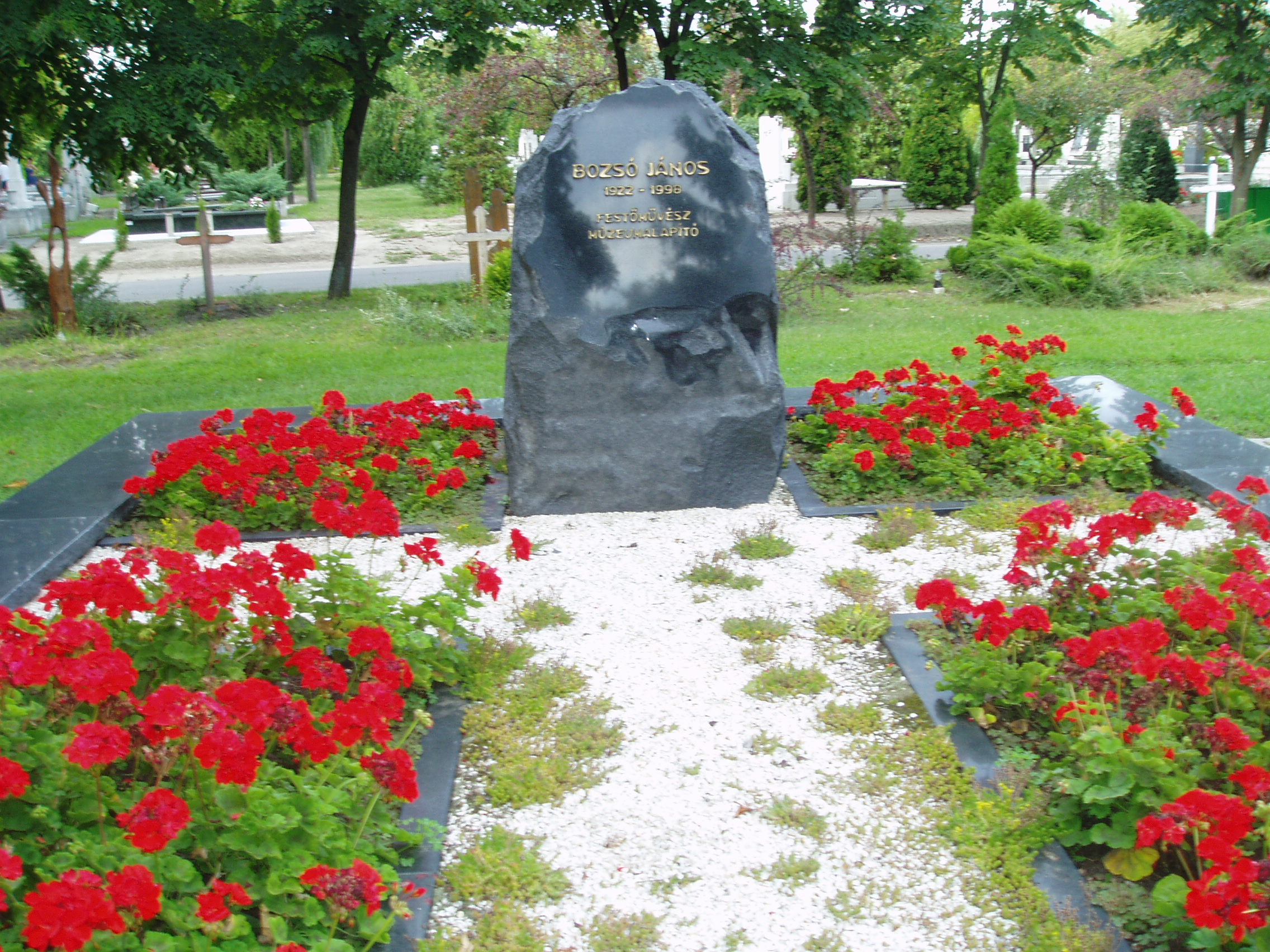 Nyilvános 961 | 1733 | Kecskemét, Béke fasor 71/A Köztemető: Bozsó János sírja | Az 1960-as években kialakított, nyárfákkal szegélyezett Béke fasor vezet Kecskemét Köztemetőjébe. Már a bejárattól jól látható Katona József hatalmas síremléke, melynek közelében alakították ki a díszsírhelyeket, ahol a város jeles polgárai nyugszanak. Itt van a sírja Bozsó János (1922-1998) festőművésznek is. Az autodidakta festő népművészeti tárgyak gyűjtőjeként fordult az alföldi festészet felé, amelynek elismert művelője lett. Műtárgyaiból magánmúzeumot alapított, amelyet 1976-ban felajánlott Kecskemét városának. A sok ezer darabból álló Bozsó gyűjtemény 1979-ben nyílt meg a nagyközönség előtt, s a festőművész egykori lakóházában látogatható (lásd: Kecskemét, Klapka u. 14.). A fénykép 2006 augusztusában készült. Felh. irod.: Heltai Nándor: Kecskemét. Kecskeméti Lapok, 1998 www.artportal.hu |
