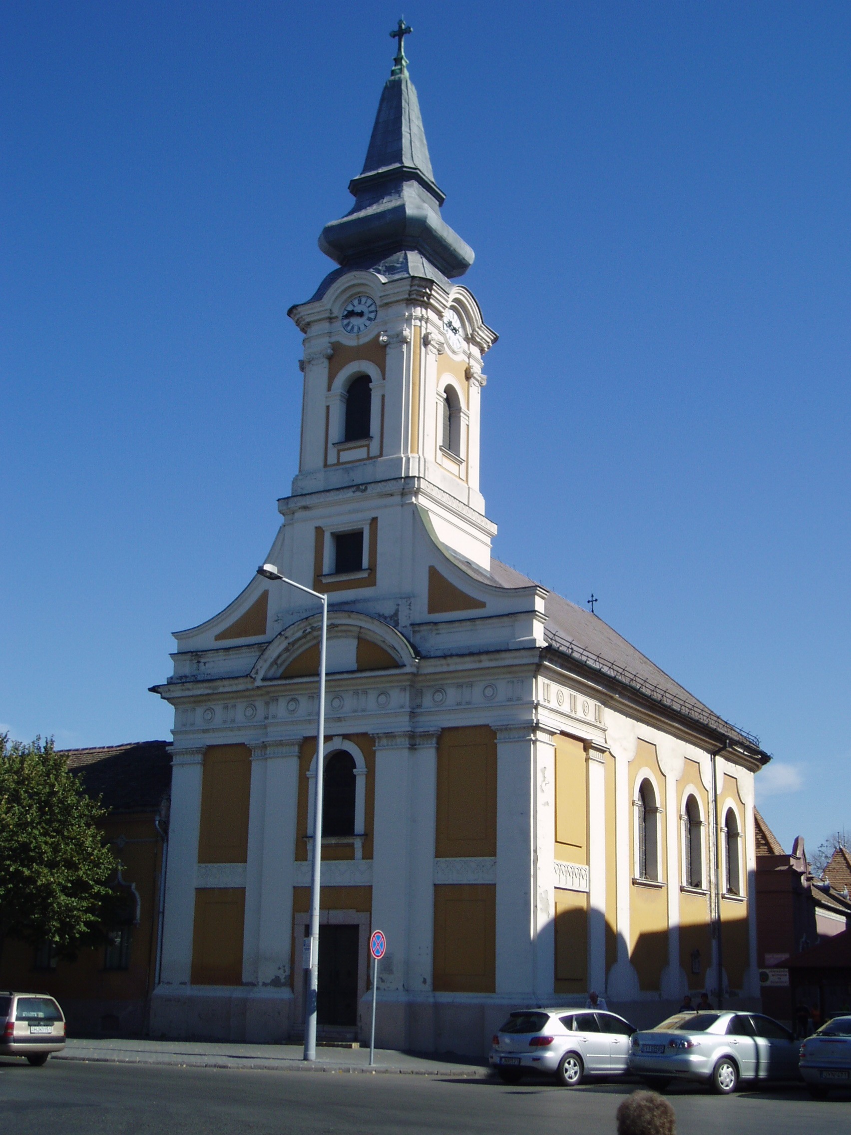 Nyilvános 906 | 1869 | Kecskemét, Széchenyi tér: Ortodox templom | Az Öregtemplommal rézsút szemben álló kicsiny, barna és fehér vakolású templomot a városba letelepedett görög és szerb kereskedők építették. A görög családok a 17. és 18. század fordulóján Kozániából és Sziatisztából a török elől menekültek az magyar Alföld ezen részére. A templom helyén a török uralom alatt dzsámi működött, annak tégláiból épült a mai templom elődje, majd 1824-től 29-ig - Fischer Boldizsár tervei szerint - klasszicista stílusban a jelenlegi temlom. A fénykép 2006 augusztusában készült. Felh. irod.: Heltai Nándor: Kecskemét. Kecskeméti Lapok, 1998 www.templom.hu |