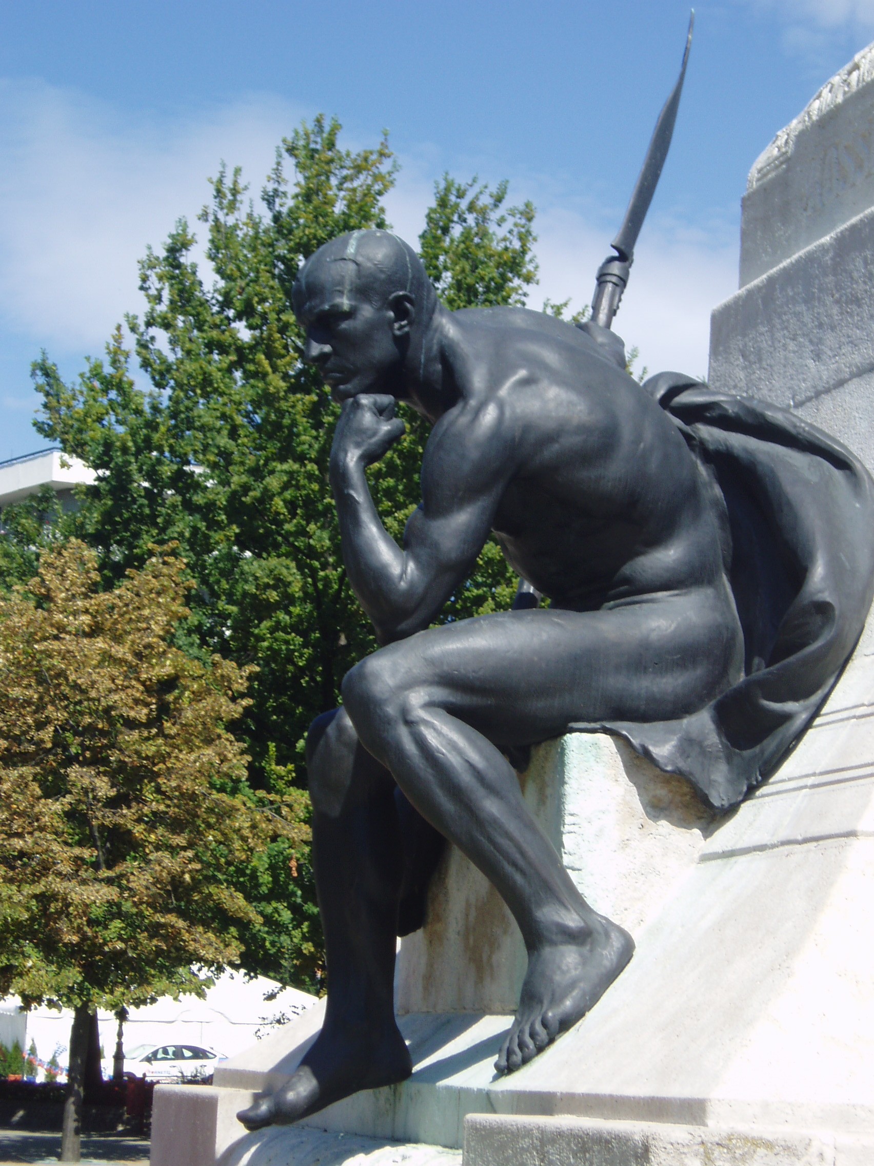 Nyilvános 877 | 1684 | Kecskemét, Kossuth tér: Kossuth Lajos szobra, mellékalak | Kossuth Lajos 2 és fél méter magas bronzszobrát, Telcs Ede alkotását 1906-ban avatták fel Kecskemét központjában. Az alkotás az 1848/49-es forradalom és szabadságharc emléke mellett Kossuth 1848. szeptember 25-én — ugyanezen a helyen, az akkori régi vásártéren — elmondott toborzó beszédét is felidézi. A szobor ülő mellékalakja kiegyenesített kaszát tart a kezében. E mellékalakról maga a szobrász mondta, hogy ugyan Rodin: Gondolkodó című híres szobrához nagyon hasonló pózban ül, de megfeszített izmokkal, készen rá, hogy ha Kossuth „mégegyszer azt üzeni”, a kezében tartott kiegyenesített kaszával rögtön rámenjen az osztrákra. A helyi hagyomány szerint e mellékalak modellje Kacsóh Pongrác, a János vitéz alapján írt daljáték zeneszerzője volt. A fénykép 2006 augusztusában készült. Felh. irod.: Heltai Nándor: Kecskemét. Kecskeméti Lapok, 1998 Orosz Andrea: Kiskunság és Felső-Bácska. Bp. Frigoria, 2004 |