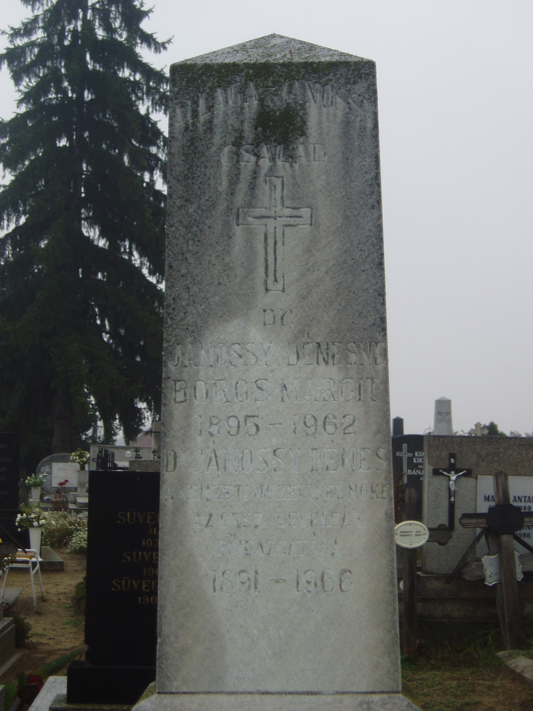 Nyilvános 867 | 1625 | Baja, Rókus utca: Rókus temető - Jánossy Dénes sírja | A temetőkápolna közelében, Allaga Géza zeneszerzővel közös sírban nyugszik a rokonsághoz tartozó Jánossy Dénes (1891-1966) levéltáros, az MTA levelező tagja. Elsősorban a XIX. század politikai történetével, különösen a Kossuth-emigrációval foglalkozott. A fénykép 2007 októberében készült. Felh. irod.: Magyar életrajzi lexikon |