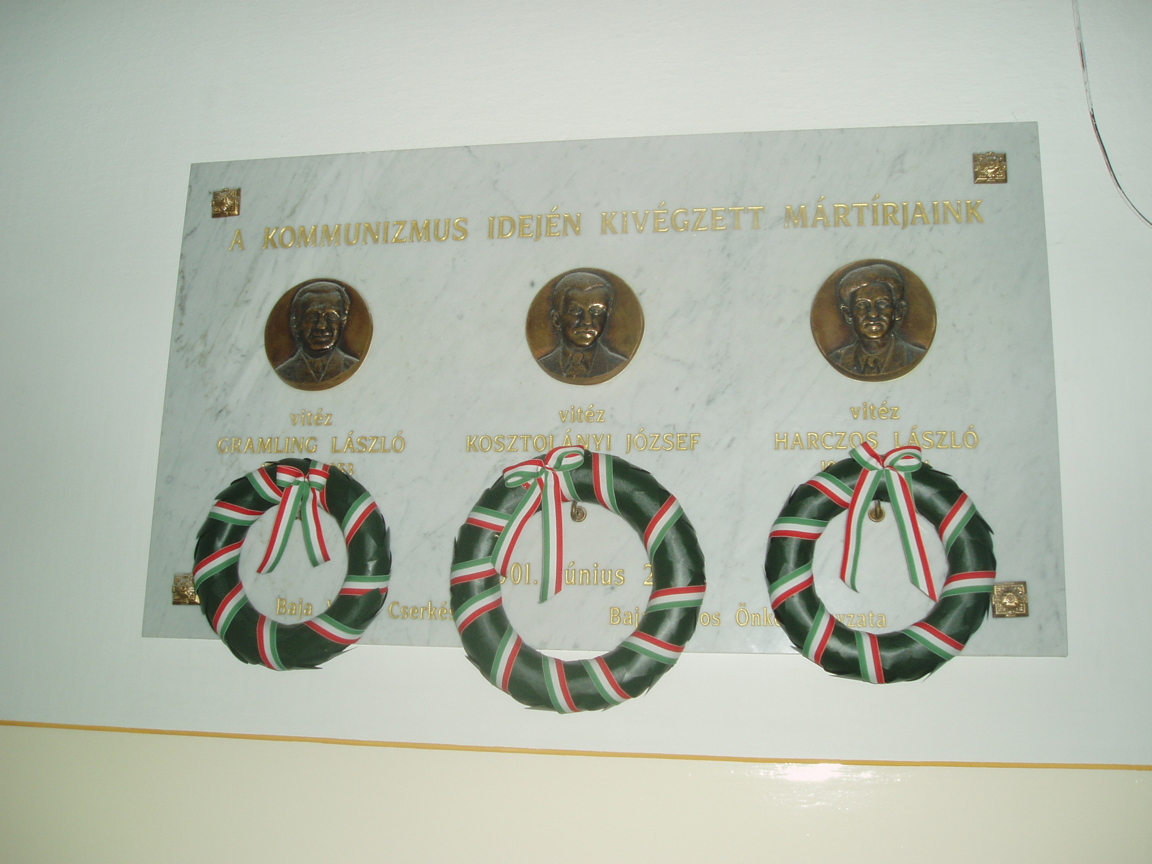 Nyilvános 847 | 1381 | Baja, Szent Imre tér 5. III. Béla Gimnázium | Vitéz Gramling László, vitéz Kosztolányi József és vitéz Harczos László emléktáblája az előcsarnok falán, akik a koncepciós perek áldozatául estek. Egykor mindhárman a gimnázium cserkészcsapatának tagjai voltak. A fénykép 2007 októberében készült. www.bajatv.hu |