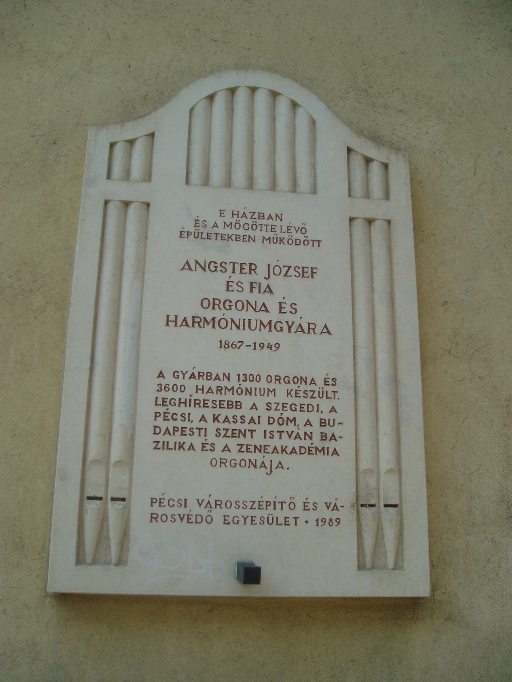 Nyilvános 858 | 1504 | Pécs, Mária utca 35. | Fénykorában itt, és a környező épületekben működött az Angster orgonagyár. Alapítója, Angster József (1834–1918) nem született bele a szakmába. Eszéki asztalos–tanoncként töltött évek után Bécsben tanulta a hangszerkészítő szakmát. Tudását Párizsban tökéletesítette a világhírű Cavaillé–Coll orgonagyárban, ahonnét az akkor elérhető legmagasabb képzettséggel érkezett haza. Saját gyárának megalapítása után az első kimagasló szakmai sikert a kalocsai székesegyház (lásd: Kalocsa, Szentháromság tér) számára megépített orgonája hozta meg számára. Az orgonaüzem többször költözött, mert a megrendelések szaporodása miatt egyre nagyobb helyre lett szüksége. A József utcába való költözés jelentette a végleges telephely kialakításának első lépését. A gyártelepet 1891-ben tovább bővítették a József utcával párhuzamos Mária utcában levő 35. számú épülettel; ezen a házon látható az 1989-ben felavatott emléktábla. A századfordulón a kitűnő Angster–orgonák már szinte benépesítették a Kárpát–medencét, sőt eljutottak az akkori határokon túlra is. A fejlődés kiemelkedő lépcsőfoka volt a pécsi Belvárosi plébániatemplom (lásd: Pécs, Széchenyi tér) orgonájának ünnepélyes felavatása 1886-ban. Közben Angster József fiai, Emil és Oszkár is bekapcsolódtak a munkába, és apjuk 1918-ban ebben a házban bekövetkezett halála után ők vezették a céget. olyan hangszerek születtek, mint a budapesti Zeneakadémia orgonája 1925-ben és a szegedi Fogadalmi templom hatalmas hangszere. 1940-ben a harmadik Angster–generáció vette át a vezetést: Angster József és Imre. Az ő háborús idejükben is megtartotta hírét az üzem, de 1949. december 28-án bekövetkezett az államosítás, a fokozatos megszüntetés, a vezetők meghurcolása és a berendezések kiselejtezése. Napjainkban az Angster–hagyomány a tudomány síkján a stuttgarti Fraunhofer tudományos intézetben Angster Judit és férje, Miklós András révén, a gyakorlatban pedig az 1992 óta működő Pécsi Orgonaépítő Manufaktúra (Pécs, Buzsáki utca 37.) munkájában folytatódik. A fénykép 2006 júliusában készült. Felh. irod.: Angster József: Az Angster-család és az Angster Orgonagyár történetéből. = Angstertől Zsolnayig. Ipartörténeti tanulmányok. Pécs, 1999 |