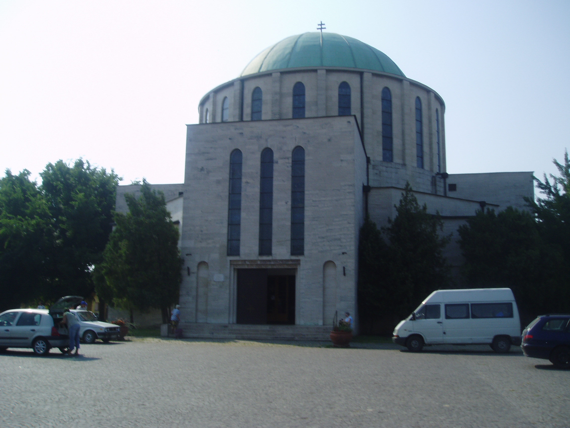 Nyilvános 1467 | 4408 | Mohács, Széchenyi tér: Fogadalmi templom | A város fő terének középpontjában áll a Fogadalmi templom hatalmas tömbje. A mohácsi csata 400. évfordulójára emlékezve építették 1929 és 1940 között, Árkay Aladár és Árkay Bertalan tervei alapján. A bizánci stílust követő, historizáló stílusú templom különlegessége, hogy alapjaiba háromezer magyar község, ötvenkét város és huszonöt megyeháza udvarából felvett egy-egy kilós földcsomagokat helyeztek el 1929-ben, jelképezve ezzel az ország összefogását. Az ország első betonhéjazatú építményének kupolája 30 méter magas és 20 méter átmérőjű, a templom 3600 fő befogadására alkalmas. Az épületben lévő műalkotások megörökítik a magyar történelem legfontosabb állomásait. Az íves oldalfalakat a középkori székesegyházakéra emlékeztető, szenteket ábrázoló üvegablakok díszítik, melyek Árkayné Sztehlo Lili (1897-1959) munkái. A kupola nonfiguratív ábrákkal teli ablakai 1984-ben Michael Gaussling német üvegművész munkája nyomán készültek. A templombelső mozaikképei, melyek Kolbe Mihály (1907-1990) mohácsi festőművész munkái, színeikkel és jelképeikkel az 1526-os mohácsi csatára utalnak. A Mohácsi Boldogasszonyként ismert régi Madonna-szobor eredete a török időkre nyúlik vissza. A fénykép 2006 júliusában készült. Felh. irod.: Látnivalók Pécsett és Baranyában. Miskolc, Well-PRess, 1998 www.mohacs.hu www.vendegvaro.hu |