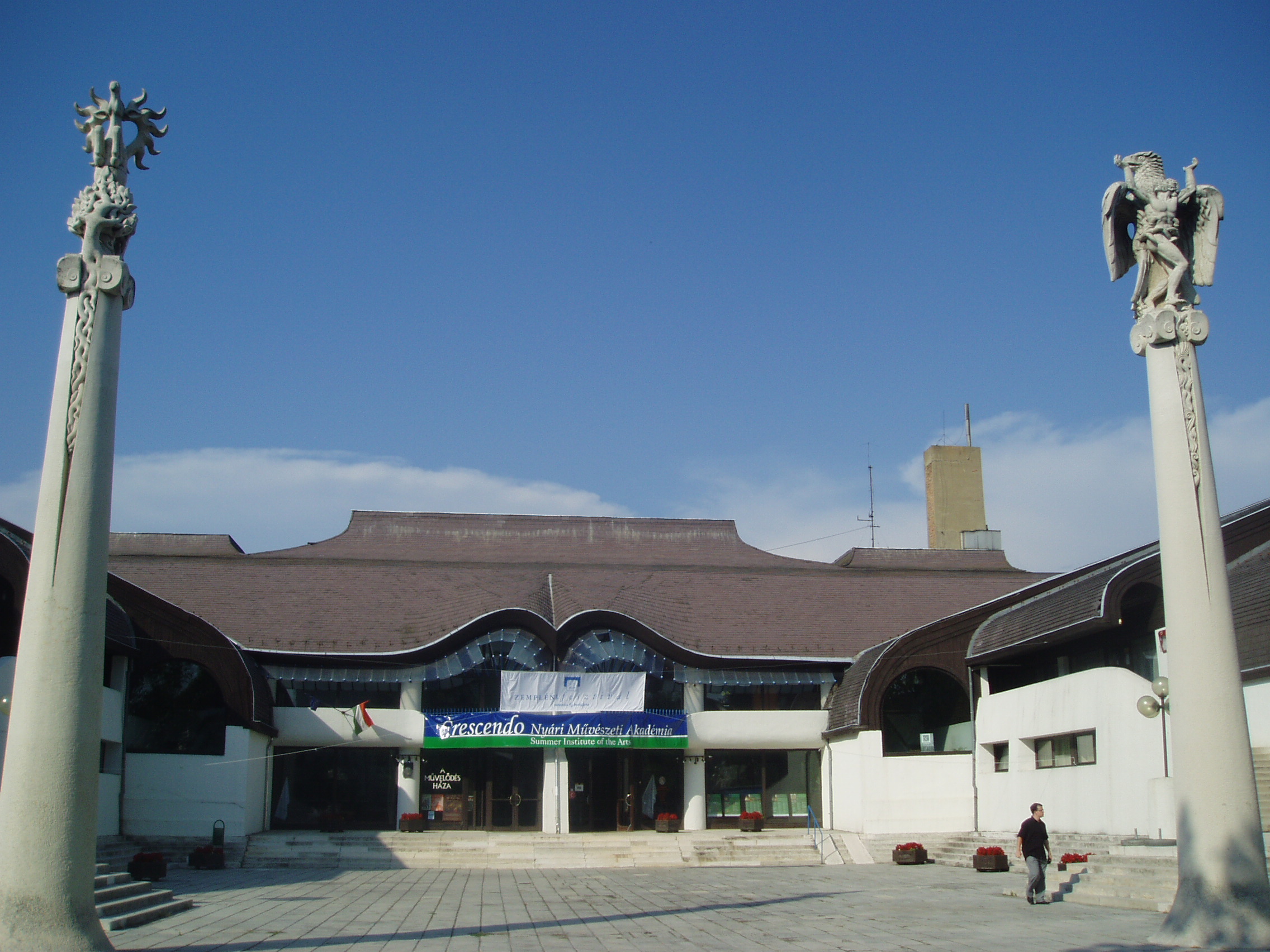 Nyilvános 1146 | 2683 | Rövid leírás | Teljes leírás (1.48 KB) | Sárospatak, Eötvös utca 21. A Művelődés Háza Sárospatak megújuló városképében nyomon követhető Makovecz Imre építész munkássága, aki több épületet tervezett a városban: a művelődési házon kívül az Árpád Vezér Gimnáziumot és a Hild tér lakóházait. A Művelődés Háza monumentális, látványos építészeti megoldásokban bővelkedő alkotás. A Kortárs magyar művészeti lexikon megállapítása szerint régészeti lelet formáját vette alapul: egy spirális, középen csappal-tengellyel ellátott díszcsat alakját. Az alaprajz szívében levő nagy színházterem a központ, innen futnak az erővonalak egészen a szélső, kisebb terekig. Megvalósítása az 1970-es évek végének politikai légkörében sok küzdelmébe került tervezőjének. Felépülése után az UIA Kairói Világkongresszusának zsűrije az 1983-as év tíz legfontosabb épületének egyikévé nyilvánította. Az épülethez szervesen kapcsolódik a főbejárat előtt álló oszlopokon a magyarság eredetére utaló két szobor, amelyek Péterffy László szobrászművész munkái. A fénykép 2007 augusztusában készült. Felh. irod.: Látnivalók Borsod-Abaúj-Zemplén megyében. Miskolc, Well-PRess, 1995 Kortárs magyar művészeti lexikon. Bp. Enciklopédia, 1999-2001 Magyarország a XX. században III. kötet. Szekszárd, Babits Kiadó, 1998 www.amuvelodeshaza.hu/bemutat.htm |