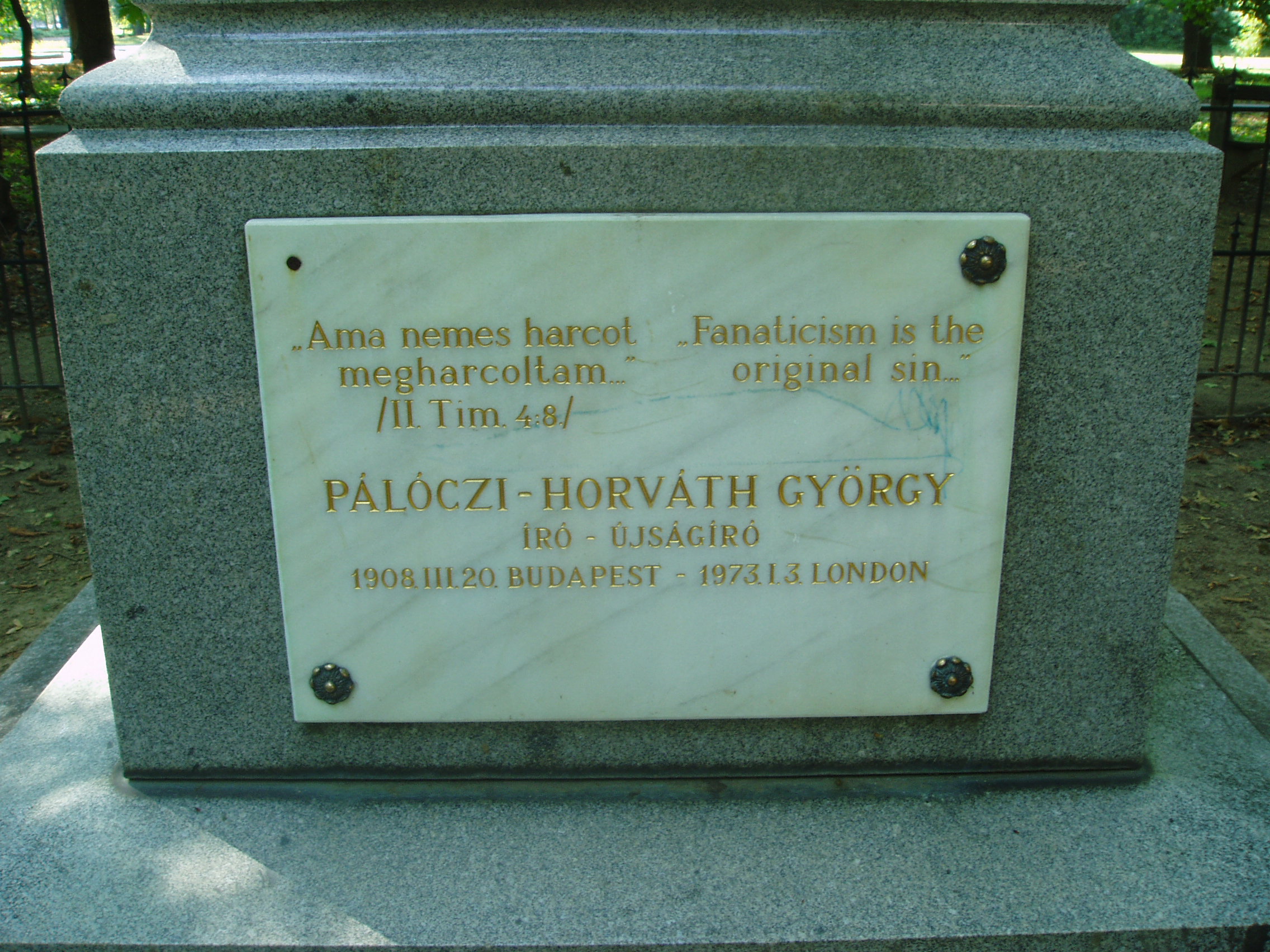 Nyilvános 826 | 1320 | Sárospatak, Iskolakert: Pálóczi-Horváth-emlékmű | A Református Kollégium (lásd: Sárospatak, Rákóczi u. 1.) bejáratával szemben találjuk az Iskolakertnek nevezett parkot. Az 1980-as években természetvédelmi területté nyilvánított Iskolakert sajátos nemzeti érték, mely egyedülálló az országban. Sétányai mentén Patakhoz kötődő jeles személyiségek szobrai állnak. 1870 körül avatták fel az Iskolakertben a Pálóczi-Horváth-testvérek emlékművét. Készítője báró Vay Miklós főiskolai gondnok, szobrászművész. A rendszerváltás után itt helyezték el Pálóczi-Horváth György (1908-1973) emléktábláját (a család leszármazottja lehetett, de erre nem találtam bizonyítékot - K.K.). Az író, újságíró fordulatos életpályát futott be. Évekig élt az Egyesült Államokban, majd hazatért rövid időre, s a Pesti Napló szerkesztőségében dolgozott. Az 1930-as évek végén ismét elutazott, és Angliában telepedett le, s az angol külügyi szolgálat kötelékébe került. Isztambulban angol összekötőként ő tárgyalt a Kállay-kormány által kiküldöttekkel, akik a kormányfő megbízásából Magyarország háborúból való kiugrását készítették elő. A háború után hazatért Budapestre, s belépett a kommunista pártba. Felelős szerkesztője lett a Tovább című pártlapnak, vezette a Magyar Rádió idegen nyelvű osztályát, majd a Hungária Könyvkiadó irodalmi vezetője lett. Megválasztották a magyar ENSZ-társaság főtitkárává. 1949-ben koholt vádak alapján letartóztatták, öt évet töltött börtönben. 1954-ben rehabilitálták, 1956 végén elhagyta Magyarországot és Londonban telepedett le. Magyar nyelvű írásai főleg a londoni Irodalmi Újságban jelentek meg, amelynek főmunkatársa volt. Visszaemlékezéseit "Elveszett nemzedék" címmel írta meg. Kitűnő műfordító is volt. Londonban hunyt el 1973-ban. A fénykép 2007 augusztusában készült. Felh. irod.: Látnivalók Borsod-Abaúj-Zemplén megyében. Miskolc, Well-PRess, 1995 www.sarospatak.hu/nevezetessegek Magyar életrajzi lexikon Rainer M. János: Esetek a magyar hírszerzés történetéből, 1957-1967. = Rubikon 2002. június-július |