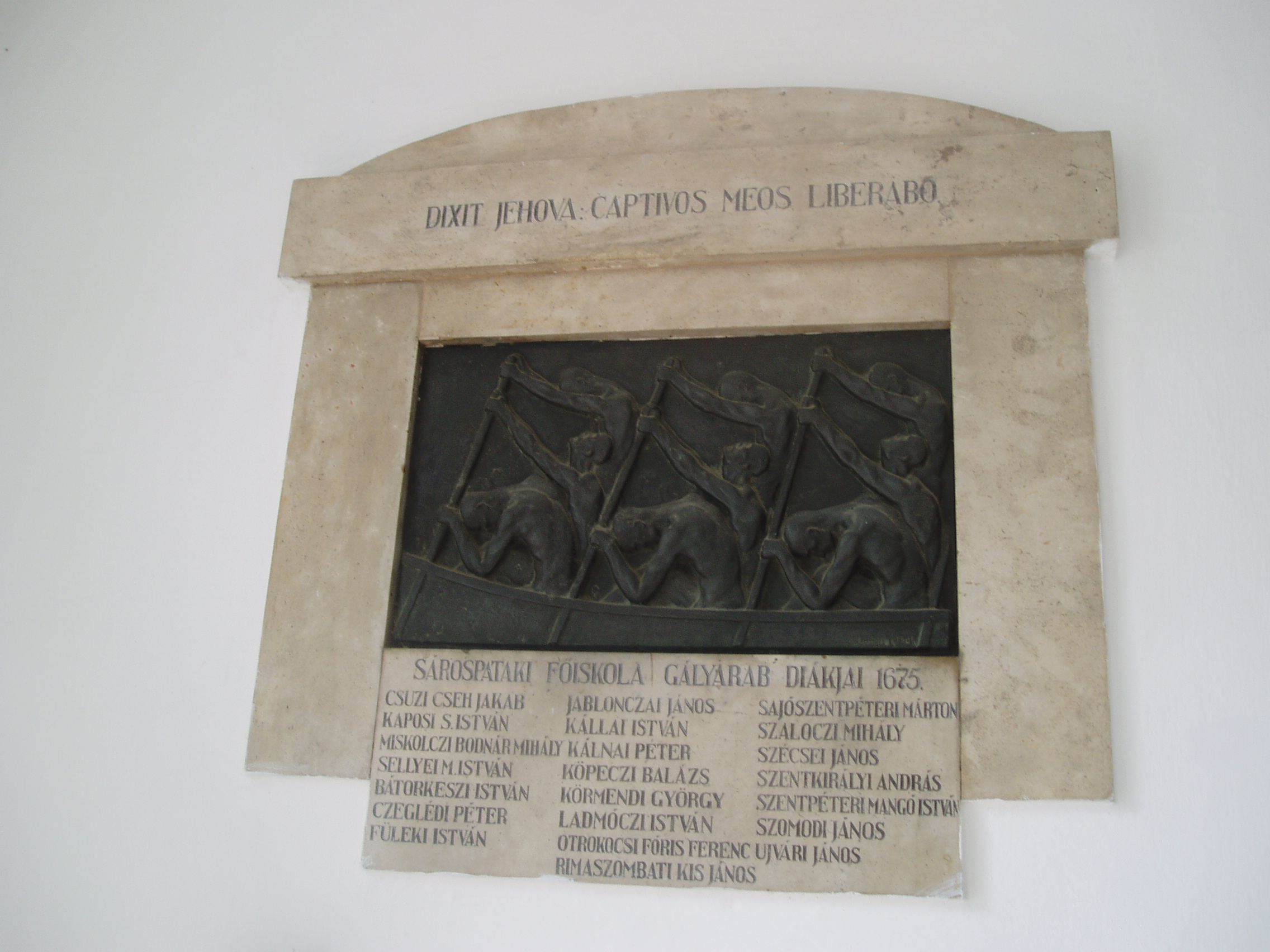 Nyilvános 812 | 1384 | Sárospatak, Rákóczi utca 1. Református Kollégium | A kollégium főépülete, a Nagy Kollégium a Rákóczi út északi végén található, mely 1804–1814 között korai klasszicista stílusban épült. Szép ráccsal ellátott, háromíves nyílású kapuzat vezet be az un. „nagyportá”-ba, amelyet két sor vaskos pillér három hajóra oszt. Kétoldalt a falakon az iskolatörténet néhány fontosabb eseményének, illetve a kollégium nagy alakjainak bronz domborművű ábrázolásait helyezték el. A képen a pataki kollégium gályarab diákjainak emléktáblája látható (Dabóczy Mihály alkotása, 1930-as évek vége). 1673-ban, a Wesselényi-összeesküvés (lásd: Sárospatak, Szent Erzsébet u. 19. Sub Rosa) leleplezése után I. Lipót császár református papokat és tanítókat ítélt gályarabságra. Közülük huszonketten pataki diákok voltak. Az ellenreformáció áldozatait 1676. február 11-én Ruyter holland admirális váltotta ki a rabságból és küldte haza (lásd még: Hajdú-Bihar megye/Debrecen, Emlékkert). A fénykép 2007 augusztusában készült. Felh. irod.: Détsy Mihály: Sárospatak. Bp. Corvina, 1974 Látnivalók Borsod-Abaúj-Zemplén megyében. Miskolc, Well-PRess, 1995 www.sarospatak.hu/nevezetessegek |