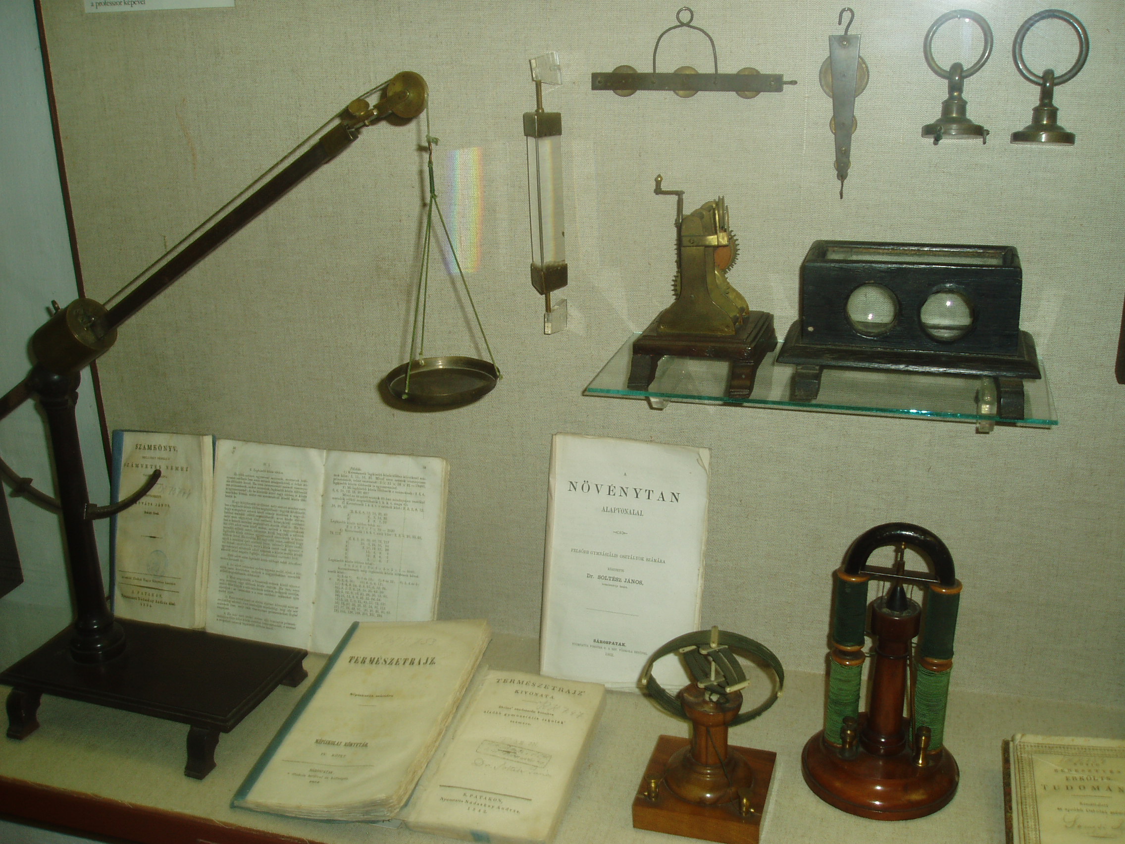 Nyilvános 812 | 1287 | Sárospatak, Rákóczi utca 1. Református Kollégium | A Kollégium főépületének szárnyai által határolt tágas udvarban áll a régi iskolaépületek utolsó maradványa, az ún. Berna-sor. 1771/72-ben a fizika oktatása számára és a fizikaprofesszor lakásául épült. Az egyemeletes, hosszú szárny déli oldalát később kétszintes, árkádos tornáccal bővítették, feljáróval a nyugati oldalon. Az épület a korabeli provinciális magyar építészet szép példája. Az emelet boltozott termeiben a kollégium történetét bemutató kiállítás látható. Kiemelt helyet kaptak a Comenius pataki működéséhez kapcsolódó tárgyak és részben Patakon írt és nyomtatott művei. Ő kezdeményezte a természettudományi oktatás szemléltető módszerének bevezetését. A képen a XVIII-XIX. században használt kísérleti eszközök és tankönyvek láthatók. A fénykép 2007 augusztusában készült. Felh. irod.: Détsy Mihály: Sárospatak. Bp. Corvina, 1974 |