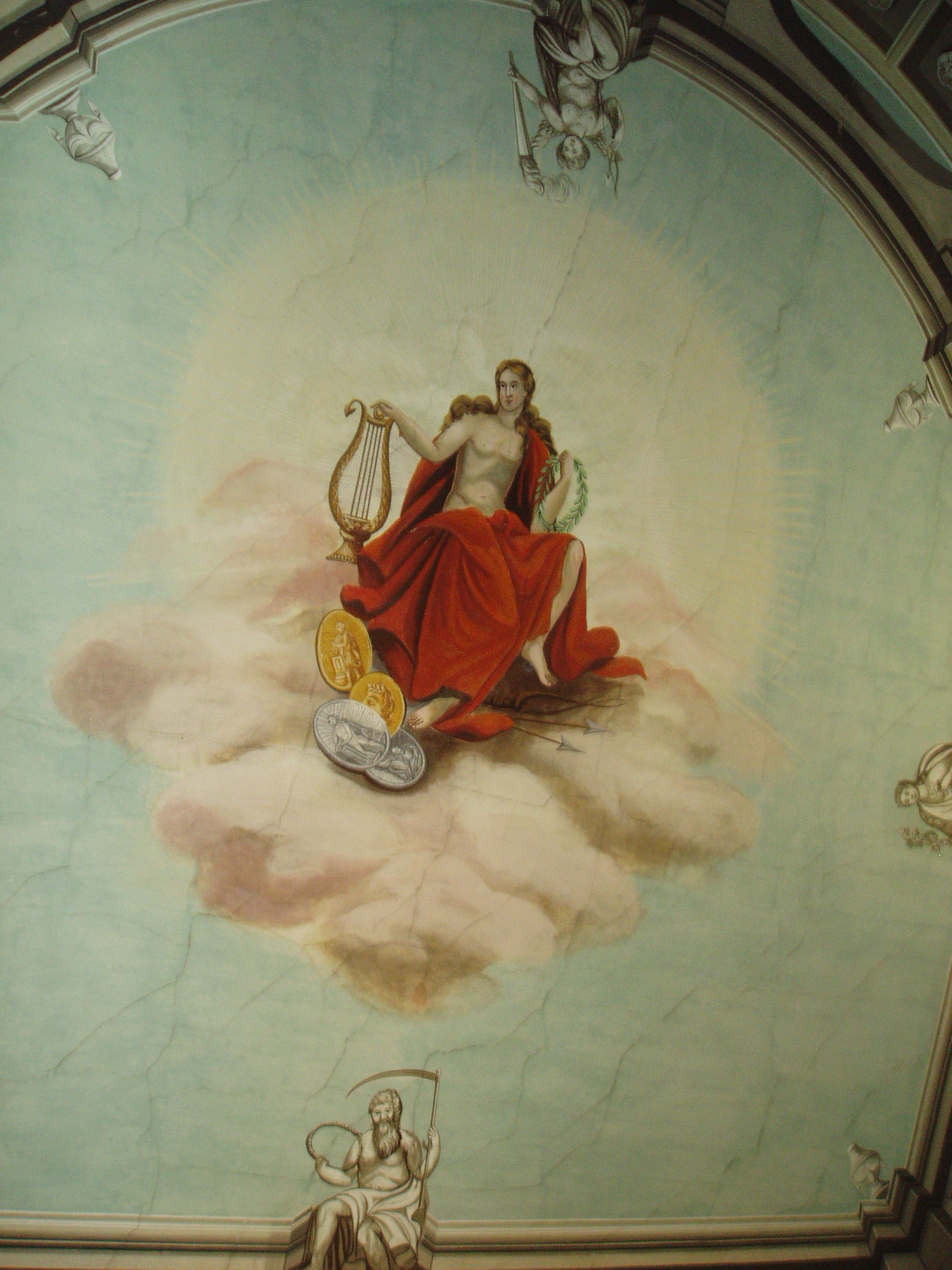 Nyilvános 792 | 1278 | Sárospatak, Rákóczi utca 1. A Református Kollégium Könyvtára | A Kollégium főépületének emeletén található az intézmény nevezetes könyvtára. A terem belső kiképzése 1834-re készült el egy "Pollack" aláírású terv alapján, ezért a magyar klasszicizmus nagy mesterének, Pollack Mihálynak tulajdonítják a pompás interieurt. Az elnyújtott, két emeletet egybefoglaló termet fából épült dór oszlopsor veszi körül, amelynek gerendázata galériát tart. A falak mellett az oszlopsoron és a galérián belül XIX. századi könyvállványok hordozzák a nagy értékű könyvgyűjteményt. A terem padlózata csillagmintás berakású táblás parketta. A múzsát ábrázoló mennyezetfreskó Lintzbauer József kassai festő alkotása. A fénykép 2007 augusztusában készült. Felh. irod.: Détsy Mihály: Sárospatak. Bp. Corvina, 1974 www.gradatio.hu/nagykonyvtar |
