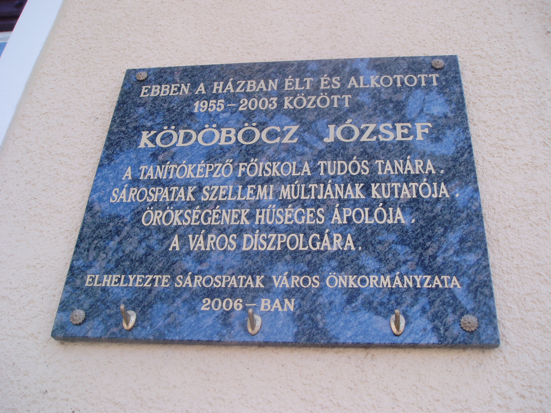 Nyilvános 785 | 1221 | Sárospatak, Rákóczi utca 21. | Ebben a házban élt és alkotott csaknem fél évszázadon keresztül haláláig Ködöböcz József (1913-2003), a Tanítóképző Főiskola tudós tanára. Élete és munkássága hetvenöt éve kötődik szorosan a Bodrog-parti Athén szellemiségéhez, amióta beregi szülőföldjét odahagyta, hogy előbb diákja, majd pedig tanára legyen a református kollégiumnak, illetve a belőle kinőtt tanítóképzőnek. Oktató és nevelő tevékenysége mellett rendszeres helytörténeti kutatásokat végzett. Először 1957-ben, a sárospataki tanítóképző centenáriuma alkalmából foglalta össze a nevelőképzés helyi históriáját, majd több részpublikáció után 1986-ban adta ki Tanítóképzés Sárospatakon – A kollégiumi és középfokú képzés négy évszázada című alapművét. Monográfiákban dolgozta fel Dezső Lajos (1984), Árvay József (1997) és Finkey Ferenc jogászprofesszor, kúriai tanácselnök életművét (1999), s nagy sikert aratott Sárospatak a magyar művelődés történetében című kötete (1991). Szerkesztette a Bibliotheca Comeniana című neveléstörténeti kiadványsorozatot. A fénykép 2007 augusztusában készült. Felh. irod.: Kováts Dániel: Ködöböcz József és a sárospataki helyismeret. = Honismeret 2001. 2. |