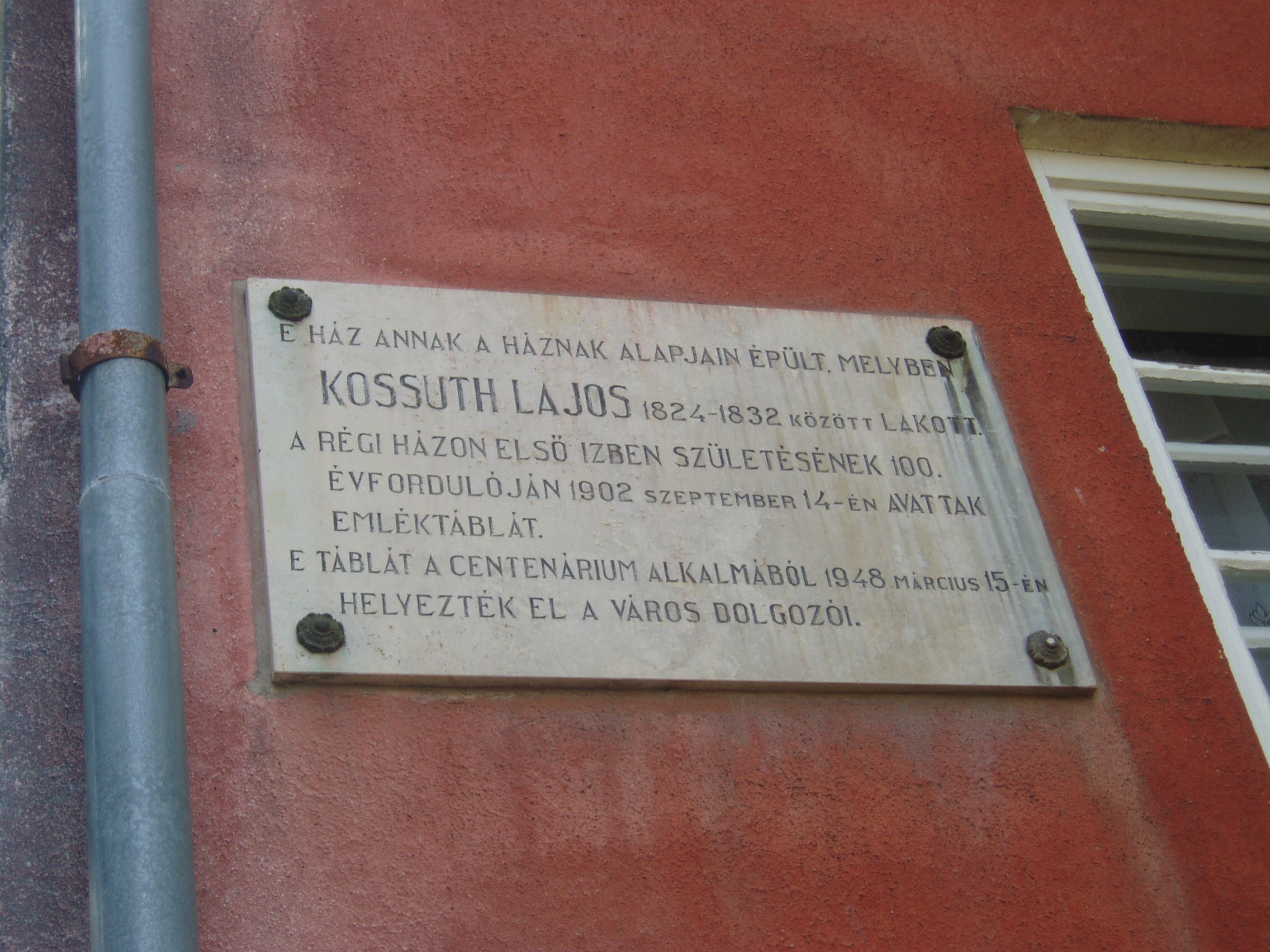 Nyilvános 815 | 1545 | Sátoraljaújhely, Hősök tere 8. | Az emléktábla tanúsága szerint ez a ház annak a régi háznak alapjain épült, amelyben a Kossuth család 1824 és 1832 között lakott. Kossuth Lajos szülei - Kossuth László, az Andrássy grófok uradalmi ügyésze és Weber Karolin - házasságkötésüket követően Monokra költöztek szolgálati lakásba. Ott született meg 1802. szeptember 19-én Kossuth Lajos. A szülők a néhány hónapos csecsemővel Olaszliszkára költöztek (ott éltek Kossuth anyai nagyszülei). 1808-ban, a tehetséges kisfiú iskoláztatása miatt Sátoraljaújhelyen telepdtek le (lásd: Sátoraljaújhely, Móricz Zs. u. 17.), ahol Kossuth Lajos a piarista iskola (lásd: Sátoraljaújhely, Deák F. u. 10-12.) növendéke lett. Amikor a Kossuth család ebben a házban élt, a húszas éveiben járó Kossuth Lajos már jogot végzett fiatalember volt. 1821-24 között Pesten tevékenykedett, de 1824-ben hazatért Sátoraljaújhelyre, hogy egyetlen fiúként könnyíthessen idősödő apja terhein és segítsen a család egyre növekvő gondjain, amelybe időközben több lánytestvér is született. A család eredeti házát Kossuth Lajos születésének 100. évfordulóján, 1902-ben jelölték meg emléktáblával. Az utódépületen látható táblát 1848 centenáriumán állították. A fénykép 2007 augusztusában készült. Felh. irod.: Ács Tibor: Kossuth Lajos. Bp. MH OKAK, 1994 http://teroses.atw.hu/eletrajz.htm |