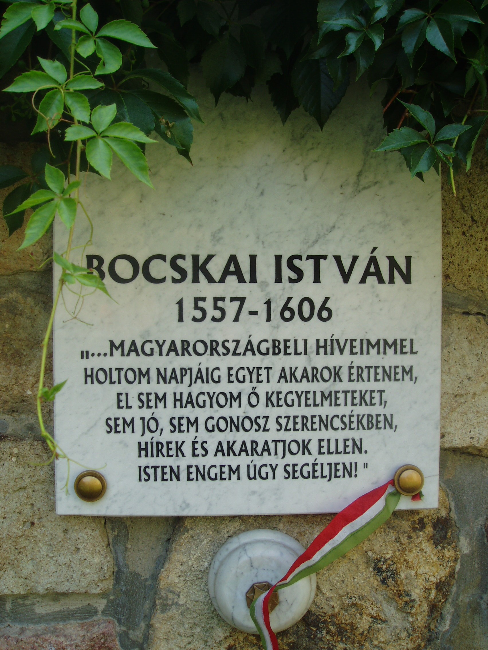 Nyilvános 766 | 1250 | Szerencs, Huszárvár utca 11. Zempléni Panteon: Bocskai István (1544-1606) emléktáblája | A szerencsi Rákóczi várnál 1996-ban, a honfoglalás ezredeik évfordulója alkalmából állították fel a jeles zempléni személyiségek panteonját. Bocskai Istvánt a szerencsi református templomban (lásd: Szerencs, Kossuth tér 4.) 1605. április 17. és 20. között megtartott nemzetegyesítő országgyűlésen választották Magyarország fejedelmévé. Ezen az országgyűlésen mondták ki a protestánsok vallásszabadságát. Bocskai 1606. március 9-én szabad királyi várossá emelte Szerencset, s lakosainak jelentős kiváltságokat adott. A fénykép 2007 augusztusában készült. Felh. irod.: Fazekas Lászlóné: Szerencs. Szerencs, Szerencsi Hírek Szerkesztősége, 1997 |