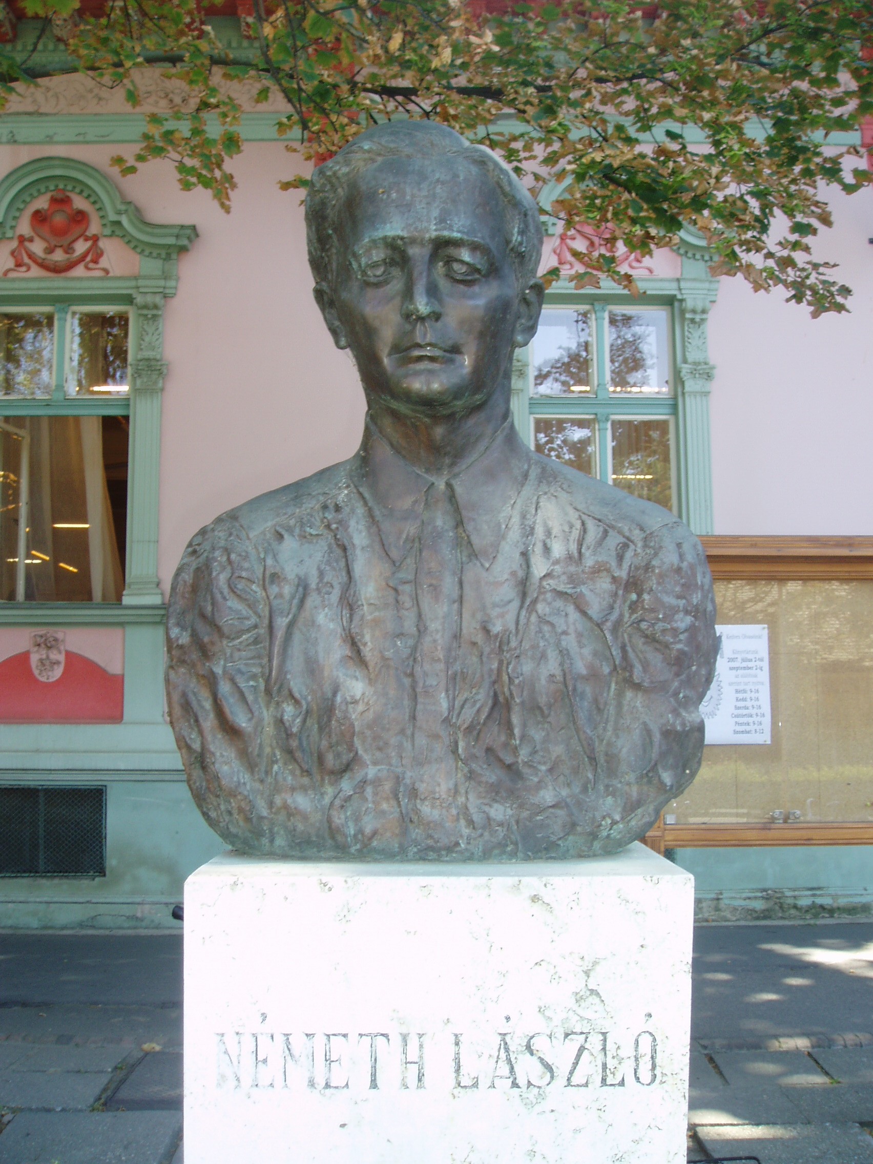 Nyilvános 1185 | 2720 | Hódmezővásárhely, Andrássy út 44. Németh László mellszobra a Németh László Városi Könyvtár előtt | A könyvtárat 1880-ban alapította a város közgyűlése. A vásárhelyi kötődésű nagy író nevét 1976-ban vette fel. Németh László a második világháborút követően több évig élt a városban. Irodalmat és matematikát tanított, s írói munkássága is rendkívül termékeny volt. Több művében, így például az Égető Eszterben is feldolgozta a vásárhelyi polgárok életét. A könyvtár épülete előtt Tóth Valéria által készített mellszobra, az épületben pedig emlékszoba idézi a XX. század egyik legnagyobb gondolkodójának szellemiségét. A Németh László Városi Könyvtár helyismereti különgyűjteménye négyezer olyan kötetet tartalmaz, amely vásárhelyi szerző műve, vagy a városról szól. A gyűjtemény őrzi többek között József Attila Medvetánc című kötetének első kiadását. A könyvritkaságok közül említést érdemel Szenci Molnár Albert (1574-1634) 1608-ban kiadott Szent Bibliája. A fénykép 2007 júliusában készült. Felh. irod.: Arató László - Bátyi Zoltán: Hódmezővásárhely az alföldi művészváros. Hódmezővásárhely, 2004 www.hodmezovasarhely.hu www.nlvk.hu/emlekszoba.php |