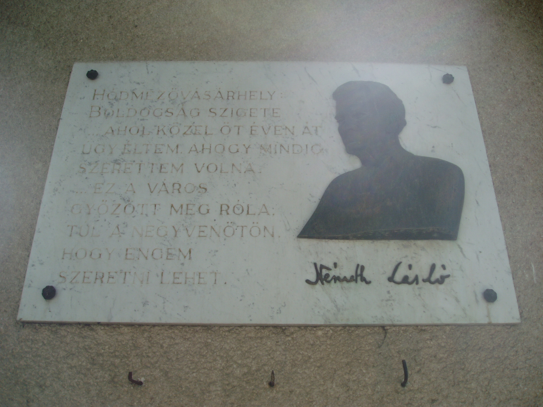 Nyilvános 1166 | 2683 | Hódmezővásárhely, Bercsényi utca 27. | Németh László 1945 szeptemberében Hódmezővásárhelyre költözött, s óraadó tanárként dolgozott a gimnáziumban. 1946 tavaszáig az Andrássy utca 9. számú épület (lásd ott) emeletén lakott, onnét költözött a Kristó-házba, a Bercsényi utca 27. alá. Belépve az udvarra, a ház végében áll a kis kerti lak, amelynek verandáján az első vásárhelyi művek, a "Mathiász panzió" és "A tanügy rendezése" íródtak. Az utcai szobában az "Eklézsia megkövetés" (dráma Misztótfalusi Kis Miklósról), a "Széchenyi", az "Égető Eszter" és más jelentős alkotások születtek. Németh László egykori otthonát ma emléktábla jelöli, rajta az író vallomásos sorai a városról. A fénykép 2007 júliusában készült. Felh. irod.: Grezsa Ferenc: Németh László Vásárhelyen. = www.nlvk.hu/vik/nemethl.htm |
