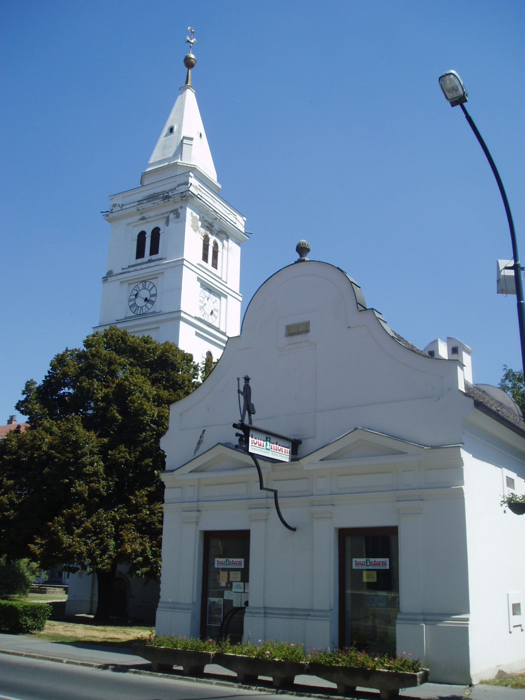 Nyilvános 1162 | 3270 | Hódmezővásárhely, Kossuth tér: Református Ótemplom és Magtár | A parkosított Kossuth tér a város főtere. Délkeleti sarkán áll a város legrégibb, legjelentősebb műemléke, a református ótemplom és a vele hajdan szerves kapcsolatban álló magtár. A templom fiókos dongaboltozatú hajója 1721 és 1723 között készült el. Két évtized múlva a templom köré lőréses téglafalat építettek, amelynek keleti és déli szakasza ma is megvan. A templom tornyában helyezték el a nagyecsedi kastély II. Rákóczi Ferenctől elkobzott óráját, csengettyűjét, amelyeket a város akkori földesura, gróf Károlyi Sándor adott el az egyháznak. A templom hajdan kazettás, festett, stilizált virágmotívumokkal díszített fatáblás mennyezetét és karzatát a budapesti Iparművészeti Múzeum, a papok padját a helyi Tornyai János Múzeum (lásd: Hódmezővásárhely, Szántó–Kovács János u. 16–18.) őrzi. A templom jeles lelkésze volt Szőnyi Benjámin (1717–1794). Megválasztása után, 1743-ban külföldi tanulmányútra ment: az Odera–menti Frankfurt, Leyden és Utrecht egyetemein hallgatott teológiát. Hazaérkezése után csaknem ötven évig működött ebben a templomban. Országos elismerést szerzett teológiai témájú könyveivel, valamint számos kiadást megért "Szentek hegedűje" című énekeskönyvével. Feliratos sírköve — epitáfiuma — a templom falánál látható. A templomi magtárat 1744-ben építtette az egyház a lakosságtól egyházi adóként begyűjtött termények és tárgyak tárolására. A jellegzetesen barokk homlokzatú épületben ma a Tourinform iroda működik. A fénykép 2007 júliusában készült. Felh. irod.: Barangolások Csongrád megyében. Miskolc, Well-PRess, 1997 /Vendégváró/ Arató László - Batyi Zoltán: Hódmezővásárhely az alföldi művészváros. Hódmezővásárhely, 2004 |