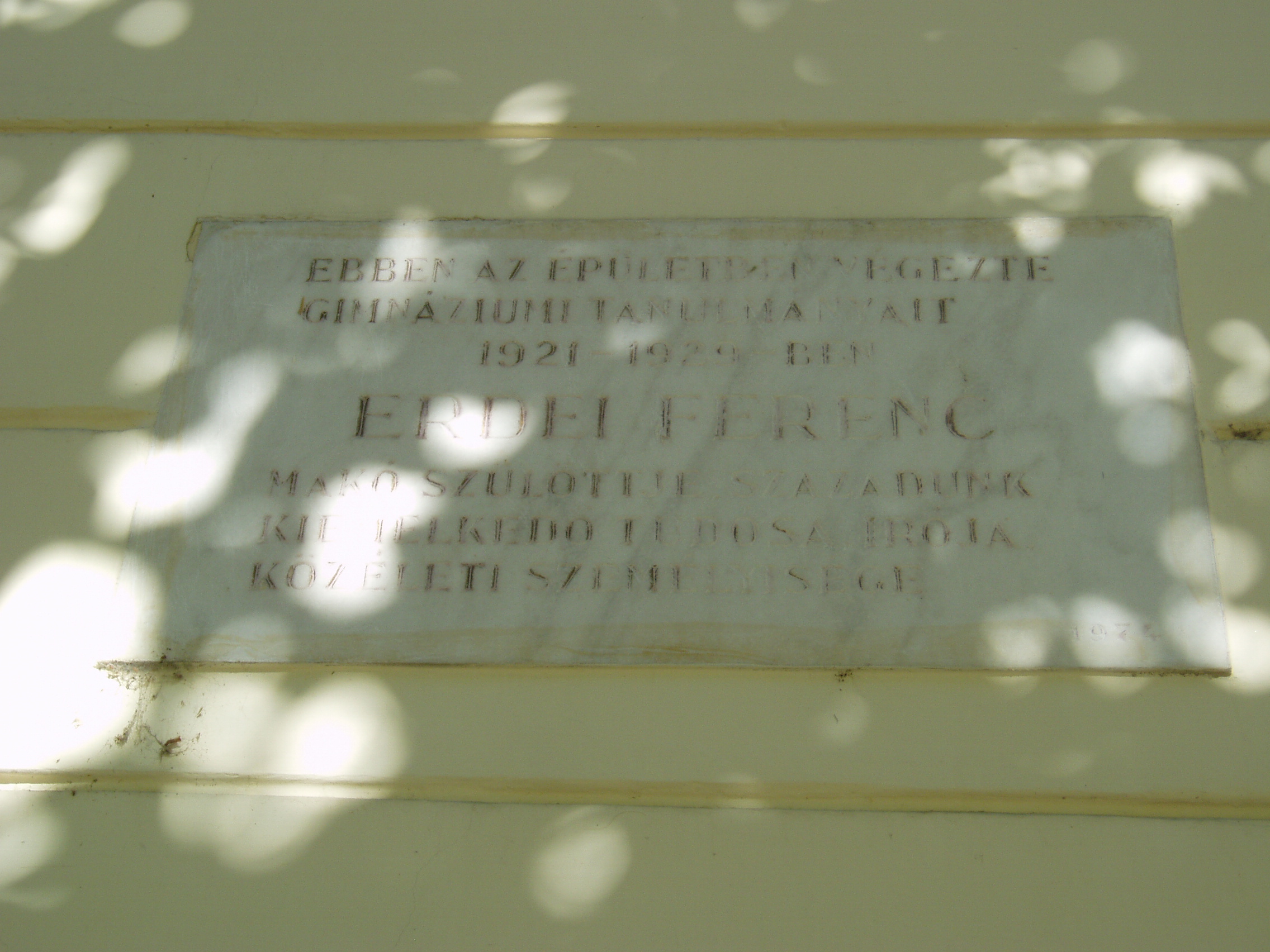 Nyilvános 867 | 1343 | Makó, Csanád vezér tér 6. József Attila Gimnázium | A város központjából északra nyílik a sugárútszerű Csanád vezér tér. Nyugati oldalán áll a József Attila Gimnázium 1895-ben, eklektikus stílusban, Gerle Lajos tervei alapján emelt épülete. Itt tanított négy évig Juhász Gyula, itt tanult József Attila, majd Erdei Ferenc. A képen Erdei Ferenc (1910-1971) agrárközgazdász, politikus, szociográfus, tudományszervező emléktáblája látható, aki az 1920-as években volt a gimnázium diákja. A fénykép 2007 júliusában készült. Felh. irod.: Barangolások Csongrád megyében. Miskolc, Well-PRess, 1997 |
