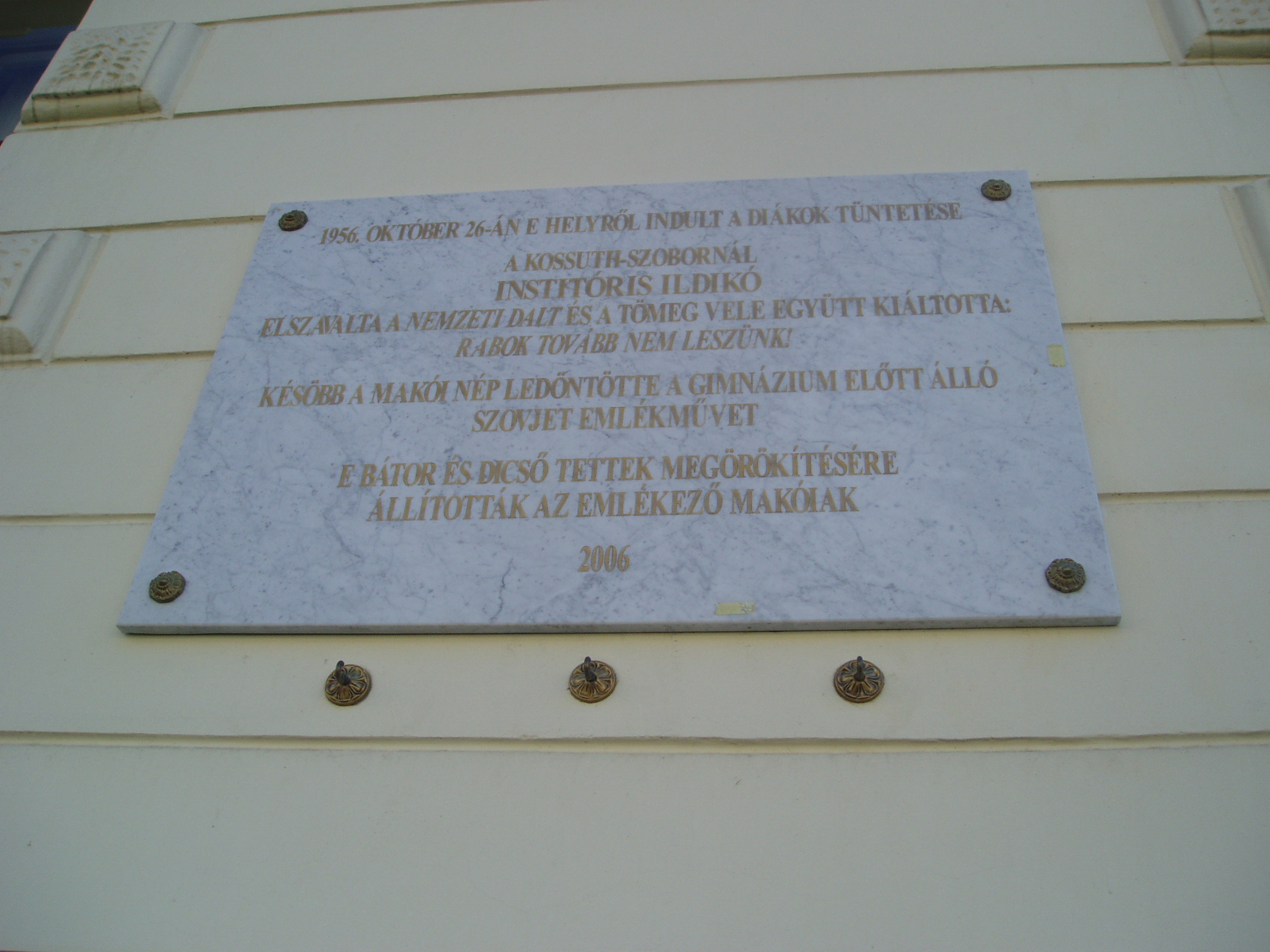 Nyilvános 802 | 1262 | Makó, Csanád vezér tér 6. József Attila Gimnázium | A város központjából északra nyílik a sugárútszerű Csanád vezér tér. Nyugati oldalán áll a József Attila Gimnázium 1895-ben, eklektikus stílusban, Gerle Lajos tervei alapján emelt épülete. Itt tanított négy évig Juhász Gyula, itt tanult József Attila, majd Erdei Ferenc. 2006-ban, az 50. évfordulón emléktáblán örökítették meg, hogy 1956. október 26-án a gimnázium elől indult a diákok felvonulása a Kossuth-szoborhoz. Később a makóiak ledöntötték az iskola előtt álló szovjet emlékművet. A fénykép 2007 júliusában készült. Felh. irod.: Barangolások Csongrád megyében. Miskolc, Well-PRess, 1997 |