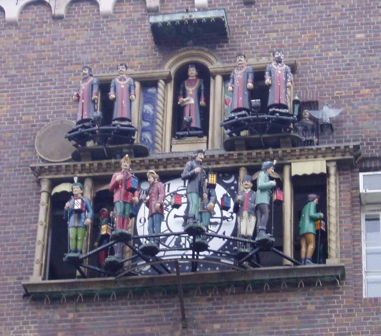 Nyilvános 818 | 2013 | Szeged, Dóm tér: Zenélő óra | A Dóm teret körülvevő egyetemi épület déli homlokzatán látható a Magyarországon egyedülálló zenélő óra, a középkori egyetemek egyik jelképe, amelyet Csuri Ferenc (1893—1959) órásmester és Kállay József faszobrász készített 1935-ben. A számlap körüli falnyílásokon az egyetemi tanácsot és a ballagó diákokat ábrázoló színes figurák vonulnak ki a Vaszy Viktor által feldolgozott Gaudeamus igitur zenéjére. A szobrocskák olyan híres emberek arcvonásait viselik magukon, mint Klebelsberg Kunó — rektorként, Brassai Sámuel, Mikes Kelemen, Petőfi Sándor, Csokonai Vitéz Mihály, Kazinczy Ferenc és mások — mint diákok. A fénykép 2004 októberében készült. Felh. irod.: Péter László: Szeged. Bp. Panoráma, 1981 www.vendegvaro.hu |