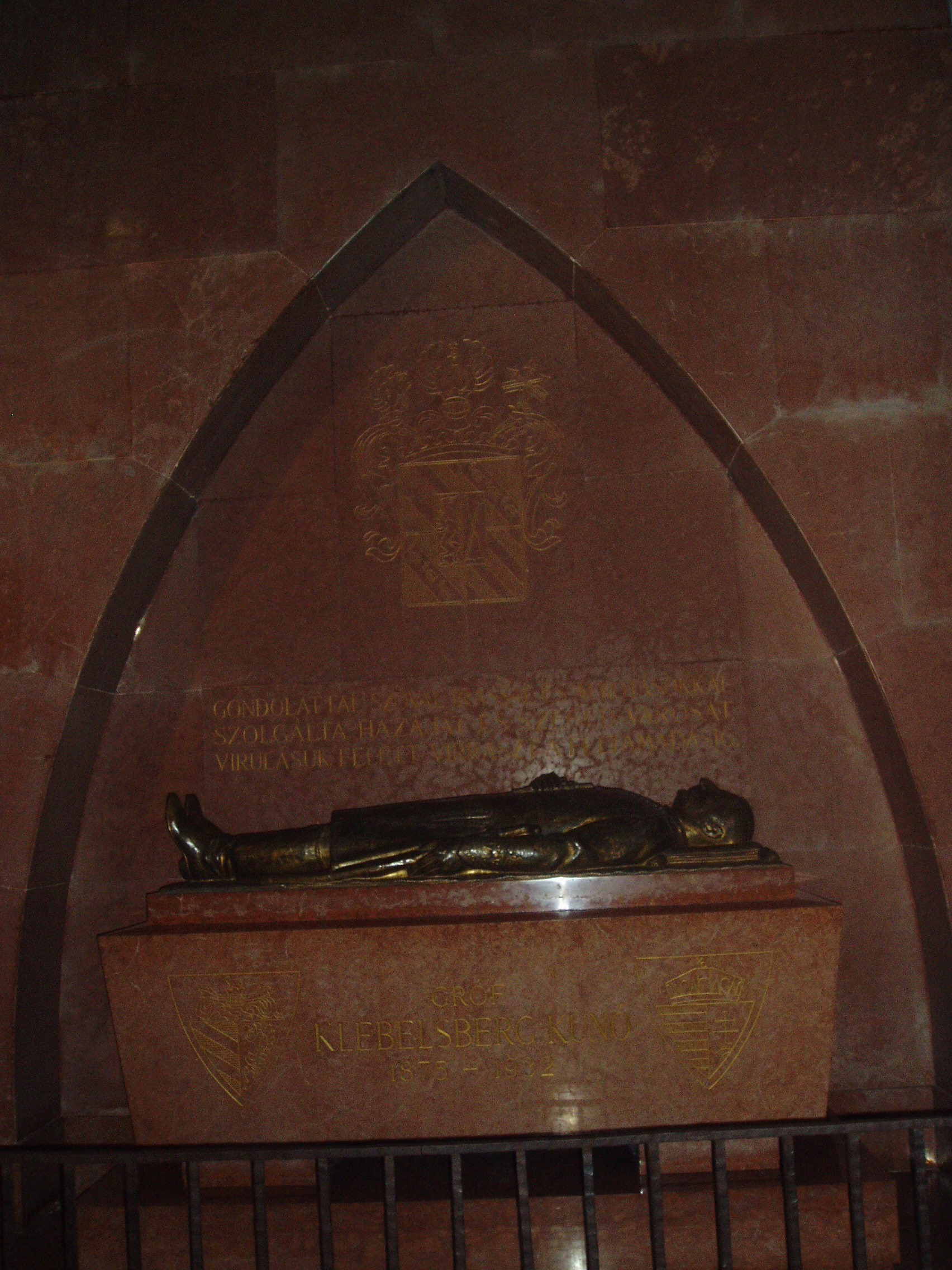 Nyilvános 825 | 1537 | Szeged, Dóm tér: Fogadalmi templom: Klebelsberg Kunó sírja | A neves jogász, országgyülési képviselő, művelődéspolitikus, kiemelkedő jelentőségű vallás- és közoktatásügyi miniszter szorosan kötődött Szegedhez, amelynek 1927-től haláláig országgyűlési képviselője is volt. Szellemi nagyságát, hihetetlen munkabírását és államférfiúi erényeit kortársainak legjobbjai és politikai ellenfelei egyaránt mind tisztelték. 56 éves korában, 1932. október 12-én hirtelen bekövetkezett halála mélyen megérintette a vezető politikai elitet. A temetése körüli megmozdulás hasonlatos volt Kossuth Lajos temetéséhez. A Nemzeti Múzeumban ravatalozták fel, majd koporsóját Szegedre kísérték, abba a városba, ahol - saját szavai szerint „népével lelki és politikai közösségre” talált. Végakaratának értelmében a Fogadalmi templomban helyezték örök nyugalomra. 2000-ben a Széchenyi téren állították fel Melocco Miklós által készített emlékművét. (A felvétel sajnos sötétre sikerült, de feltettem, mert az interneten egyáltalán nem találtam képet a síremlékről. K. K.) A fénykép 2007 júliusában készült. Felh. irod.: www.bibl.u-szeged.hu/ha/bio/klebi/klebi.html www.wikipedia.org |