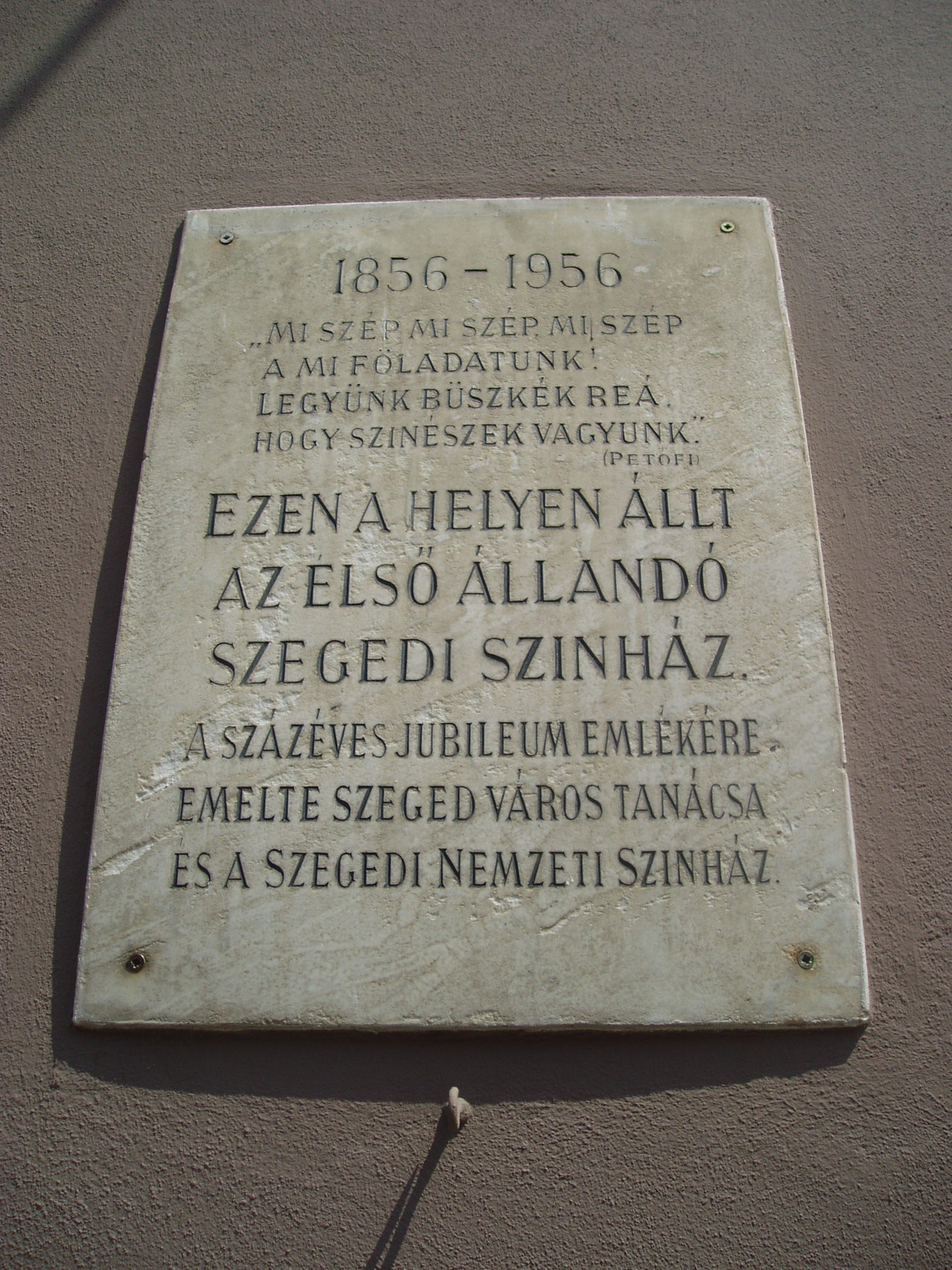 Nyilvános 812 | 1300 | Szeged, Kelemen László utca 3. | Itt, a mai Hági étterem kerthelyiségének helyén állott Szeged első állandó, 1856-ban fából épült színháza, amelynek a Sörkert utcai homlokzaton állítottak emléktáblát. Az utcát az 1879-es árvízig Színház utcának is nevezték, ma pedig Kelemen László, az első magyar színigazgató nevét viseli, aki társulatával hosszabb ideig játszott Szegeden is (lásd: Szeged, Széchenyi tér 10.). Játszott itt Lendvay Márton, Szerdahelyi Kálmán, Prielle Kornélia. A színkör életében különösen emlékezetes volt az 1860/61-es évad, amelyet később a szegedi színjátszás aranykorának neveznek a színháztörténészek. Molnár György igazgató műsorpolitikáját egyfelől a közönség szórakoztatása, másfelől a haza iránti elkötelezettség határozza meg. A társulat megérkezésekor robbant ki a „kis forradalom”-nak nevezett tüntetéssorozat, amikor a szegediek a városháza előtt összegyűlve a betiltott Himnuszt, a Klapka– és Kossuth–indulókat énekelték a színészekkel együt, majd leverték az épületekről a császári címereket. A nagy árvízt követő újjáépítéssel szinte egyidőben határozta el a város, hogy méltó kőszínházat emel. A ma is álló épületet (lásd: Szeged, Deák Ferenc utca 12.) 1883-ban adták át rendeltetésének. A fénykép 2007 júliusában készült. Felh. irod.: Péter László: Szeged. Bp. Panoráma, 1981 Sándor János: A szegedi színjátszás krónikája. Szeged, Bába Kiadó, 2003 |
