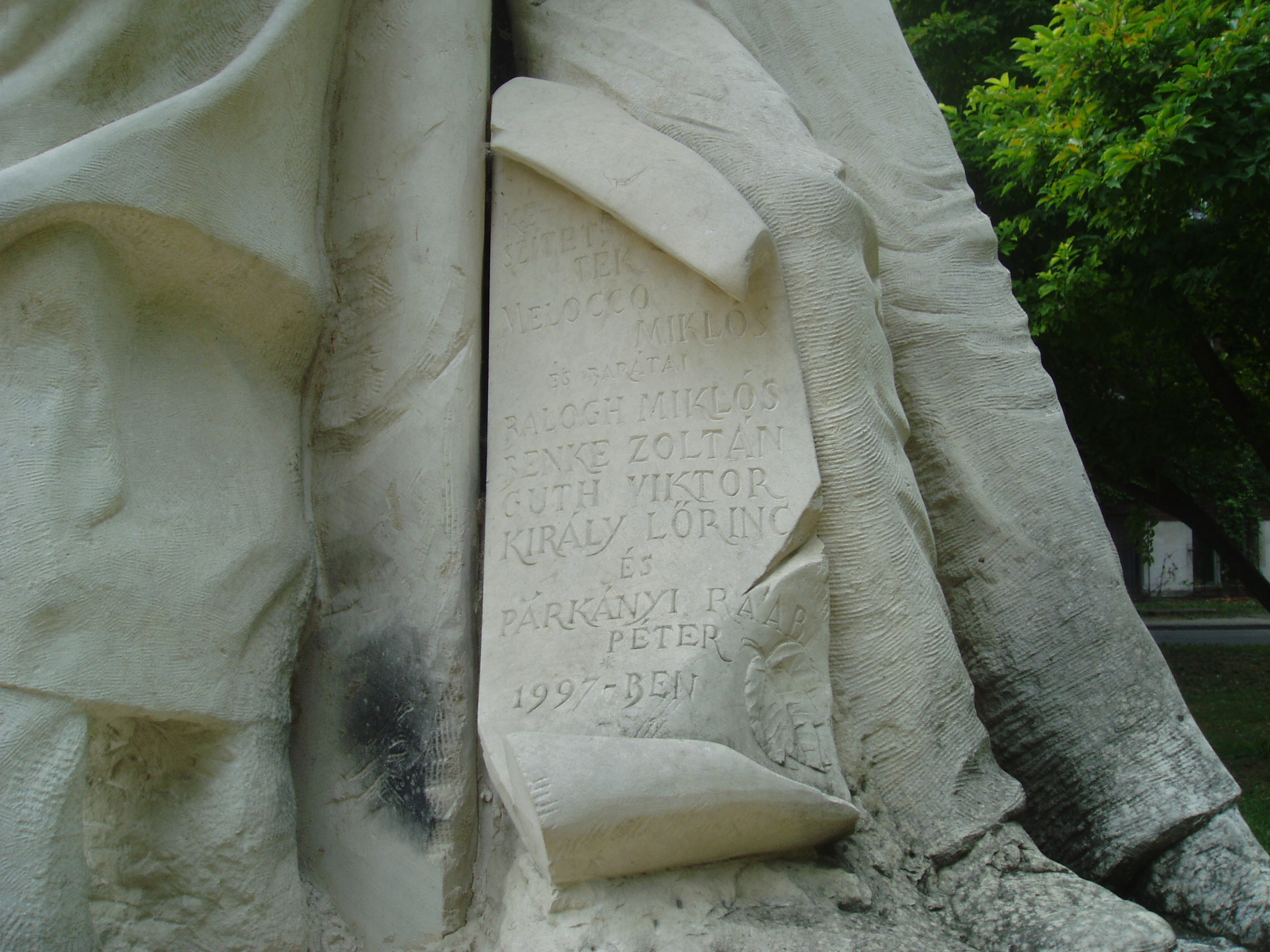 Nyilvános 802 | 1312 | Szeged, Rerrich tér: Melocco Miklós 1956-os emlékműve | Szeged egyik legelzártabb terén, egy nagy oktatási épület és a Dóm tér között áll Melocco Miklós bolgár mészkőből faragott 1956-os emlékműve, amelyen egy óriás lepkét, a szabadság szimbólumát emelik magasba az 56-os forradalom vértanúi. Alkotója így vallott a szoborcsoportról: "A felnagyított rovarban van valami a szörnyből, hatalmas fej összetett szemekkel, pödörnyelvvel, erős rágókkal, ijesztő, mint egy tank. Nekem ez a szabadság lepkéje. De a Szabadság cserben hagyta a szabadságharcosokat. Voltaképpen uszító volt, felbujtó, pillanatokra mindenki érezte, mi ez, de beszélni már nem tudott róla, mert annyira gyorsan illanó dolog. Talán nem is létezik, mint az abszolút igazság. Mégis olyan toborzó erejűnek mutatkozott 1956-ban, hogy érdemes volt meghalni is érte. ... ... nem az úgynevezett sztárokat, a forradalom arisztokráciáját, Nagy Imrét, Malétert akartam ‘56-ból megörökíteni, mert az másmilyen szobrot követelt volna, hanem az utca népét, akiket magam is ismertem, ismerem. ... A szoborcsoportoknak nevet, fejezetcímeket, mint a regényekben szokás, nem adtam. De van benne szerelmes pár, vagy ember pár; van bajtárs, ahogy Komondi Sándor megragadja Csűrös Zoltánt, aki összeesik. Egy-egy arc több típust is képvisel. Van ott egy elegáns úr, aki visszafordulna, de a tömeg nem engedi. Börtönben is ült valamikor, de ő csak győztes akart lenni, nem hősi halott. A szobor hátsó részen ott fekszik Danner János alakja, akin átlépnek, mert nem veszik észre, hogy meghalt. Észrevétlenül vált halott hőssé. Nem volt sem időm, sem pénzem arra, hogy szót ejtsek a pocsék emberről, a gyáváról, aki elbújva várta ki a fejleményeket. Én csak a szépet akartam megmutatni..." A fénykép 2007 júliusában készült. Felh. irod.: Buka Adrienne: A szabadság pillangója. Melocco Miklós a szegedi '56-os emlékműről. = www.sulinet.hu |