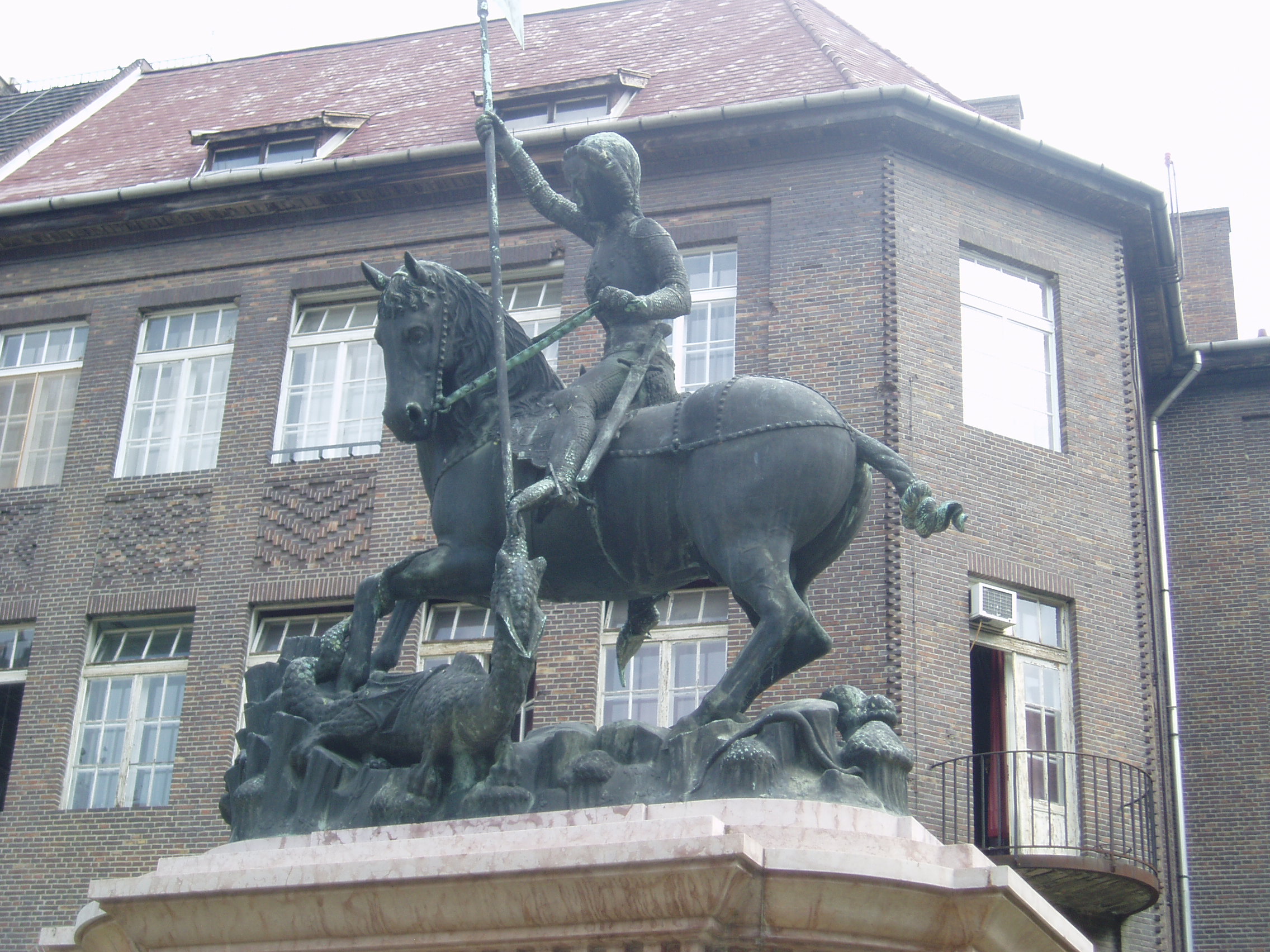 Nyilvános 873 | 2725 | Szeged, Rerrich tér: Sárkányölő Szent György lovasszobra | A Dóm tőszomszédságában elhelyezkedő kis, intim hangulatú téren állították fel a Kolozsvári-testvérek 1373-ban készített, Szent Györgyöt ábrázoló lovasszobrának másolatát, amelyet Krausz Ferenc öntött 1938-ban Budapesten. A szobor, mely a városnak a nagyhírű kolozsvári egyetemhez való szellemi kötődését jelképezi, Klebelsberg Kunó kultuszminiszternek köszönhetően került Szegedre. Az eredeti műalkotás a prágai vár udvarán, a Hradzsinban látható. A fénykép 2007 júliusában készült. Felh. irod.: Péter László: Szeged. Bp. Panoráma, 1981 http://users.cwi.hu/idegenvezetes |