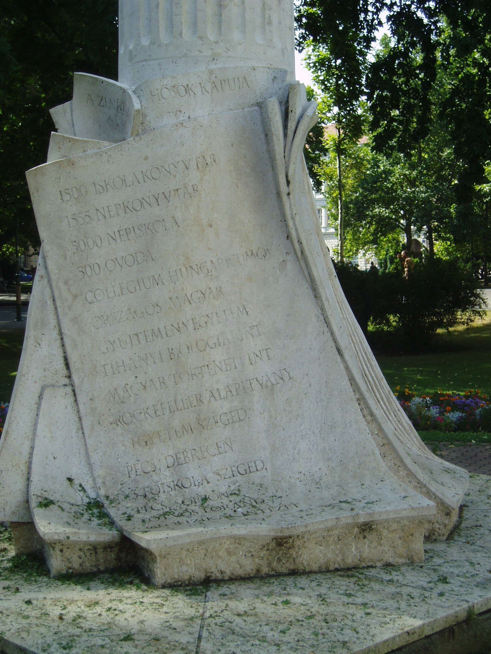 Nyilvános 830 | 1477 | Szeged, Széchenyi tér: Klebelsberg Kunó emlékműve | A Széchenyi tér hazánk egyik legszebb, legnagyobb, szabályos négyszögű tere. A város közigazgatási és forgalmi központja. 1848-ban Szabadság térnek nevezték el. Mai nevét 1860-ban, Széchenyi István halála után kapta. A mintaszerűen parkosított tér parktükreit művészi értékű szobrok díszítik. A Bérház (lásd: Szeged, Széchenyi tér 11.) előtti parkrész közepén áll Klebelsberg Kunó emlékműve, Melocco Miklós alkotása (2000). A mészkőből készült, szokatlan megformálású emlékmű a tetteiben mérhető politikust és a szellem emberét ábrázolja. Mivel nagyobb léptékű alkotás elkészítésére nem kapott anyagi lehetőséget, Melocco úgy formálta meg a szobrot, hogy feliratokkal utalt Klebelsberg elsősorban kultuszminiszterként végzett példátlanul sokrétű és eredményes tevékenységére. A politikus erősen kötődött Szegedhez, amelynek országgyűlési képviselője volt. Sírja a Fogadalmi templomban van (lásd: Szeged, Dóm: Klebelsberg Kunó sírja). A fénykép 2007 júliusában készült. Felh. irod.: Péter László: Szeged. Bp. Panoráma, 1981 www.szeged.hu Klebelsberg nem ismert lehetetlent. [Halász Zsuzsa beszélgetése Melocco Miklóssal.] = http://mkdsz1.freeweb.hu/n12/09halasz_melocco.htm |