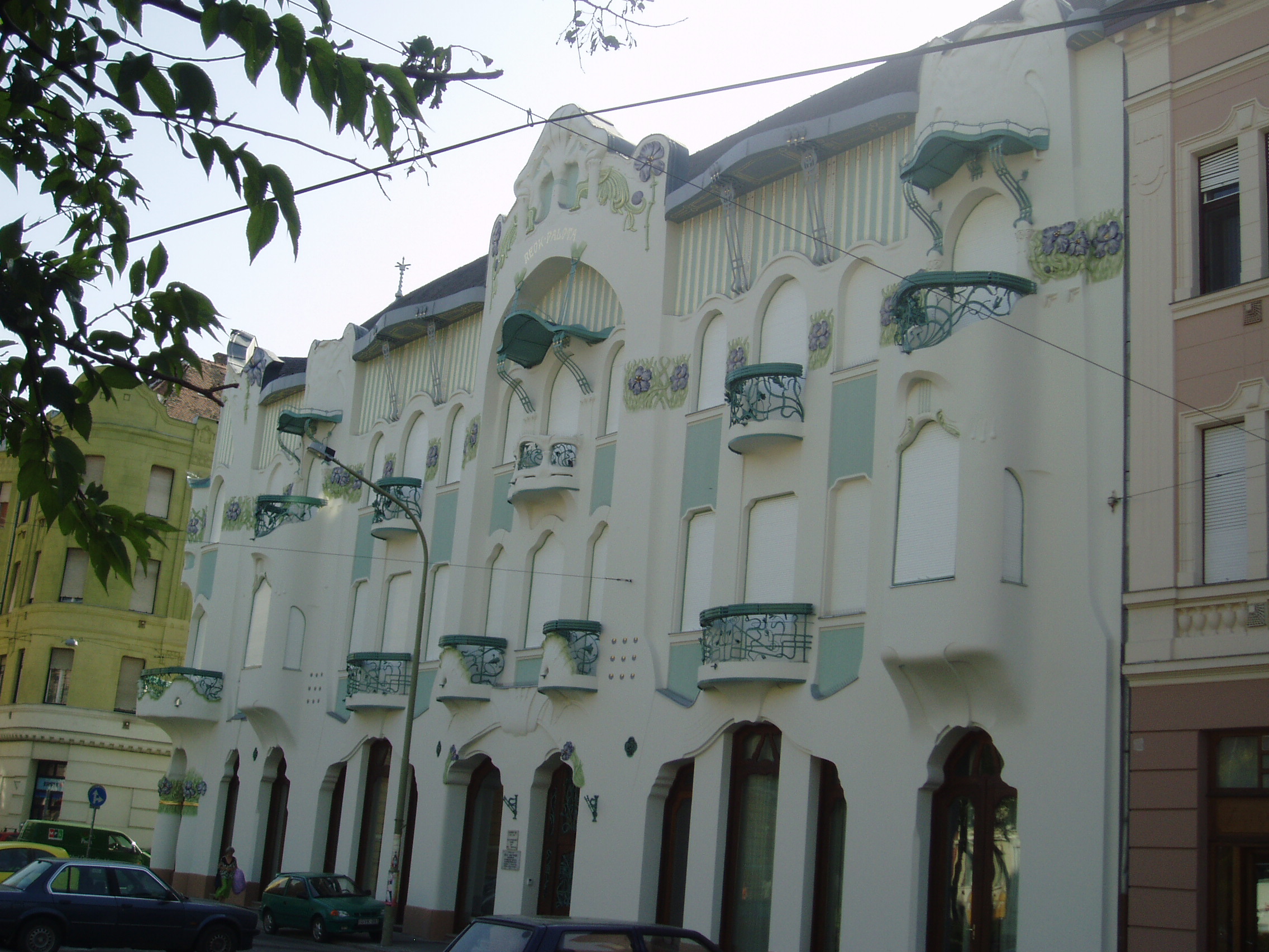 Nyilvános 837 | 1242 | Szeged, Tisza Lajos körút 56. Reök-palota | A Reök-palota 1907-ben épült szecessziós stílusban Magyar Ede (1878-1912) tervei szerint. Tragikus fiatalon halálba ment alkotója 1901-től működött Szegeden. A jól képzett, külföldet járt fiatal építésznek második szegedi munkája volt a Reök István vízügyi mérnöktől, Munkácsy Mihály unokaöccsétől kapott megbízás. Ez az épület a hazai szecesszió egységes, tiszta stílusú megtestesülése; európai viszonylatban is a legszebbek egyike. Tagolása leginkább Gaudi lakóházainak szerkezetére emlékeztet. A homlokzaton indázó virágmotívumos díszítés a belső terekben is megtalálható, és a kovácsoltvas korlátok is ezt a mintát folytatják. A kovácsoltvas tartozékokat, amelyek a szegedi művészi vasipar csúcsteljesítményei, Fekete Pál, kitűnő szegedi kovácsművész készítette Magyar Ede rajzai alapján. Az épületet 2006-ban teljesen felújították (némely vélemény szerint új színezése nem szerencsés) és 2007. augusztus 17-én mint az "Európa Kulturális Fővárosa 2010" rendezvénysorozat Regionális Összművészeti Központja kezdte meg működését. A fénykép 2007 júliusában készült. Felh. irod.: Péter László: Szeged. Bp. Panoráma, 1981 www.puszta.com/hun/programs/cikk/reok_palota_ujjaszuletese |
