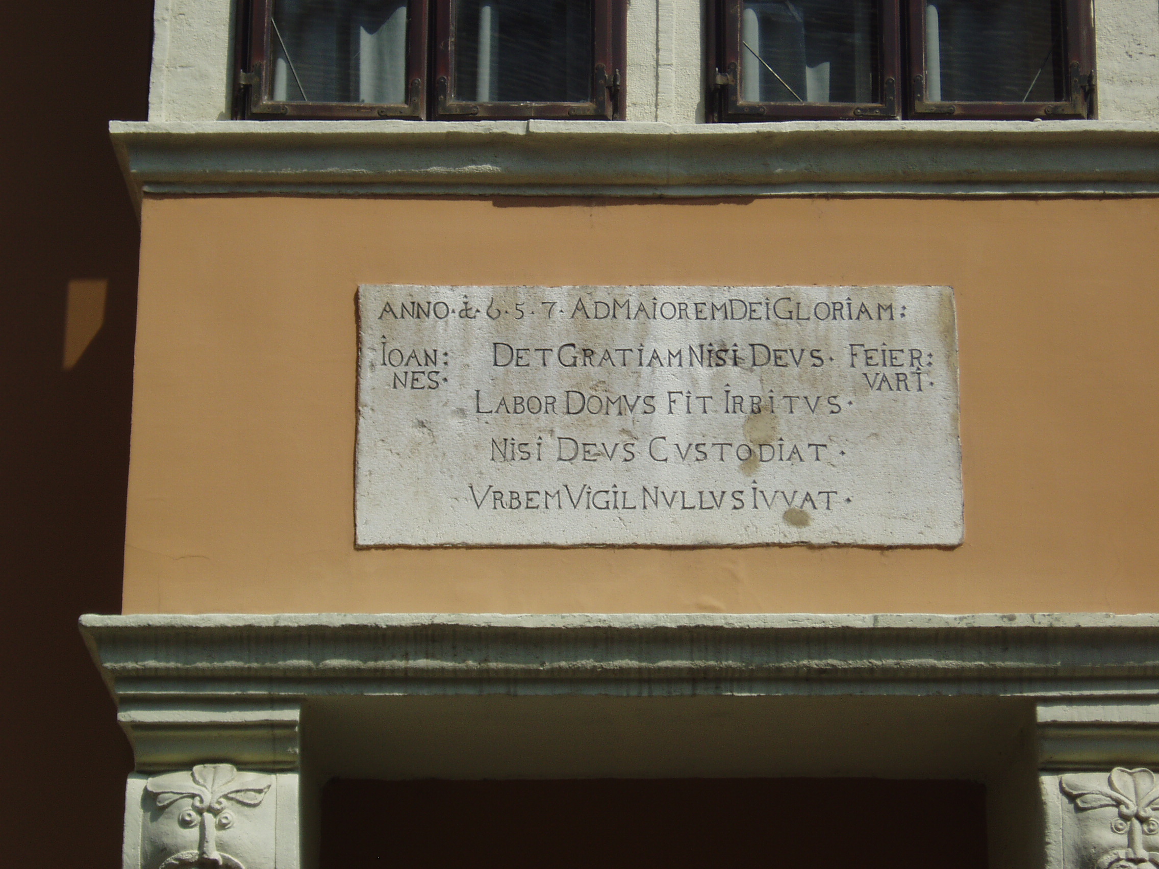 Nyilvános 873 | 1392 | Győr, Apáca utca 9. Fejérvári-ház | Győr egyik legpatinásabb épületét 1657-ben emelték, amint a homlokzatán elhelyezett latin nyelvű emléktáblán is olvasható, majd 1770 körül átalakították. A későreneszánsz-korabarokk ház kapujának zárókövén a Fejérvári család címere, egy csőrében patkót tartó vadliba látható. Első emeleti zárt erkélye maszkban végződő csigavonalas konzolokon nyugszik. A felvétel 2008 május végén készült. Felh. irod.: Cziglényi László: Győr. Bp. Panoráma, 1981 |