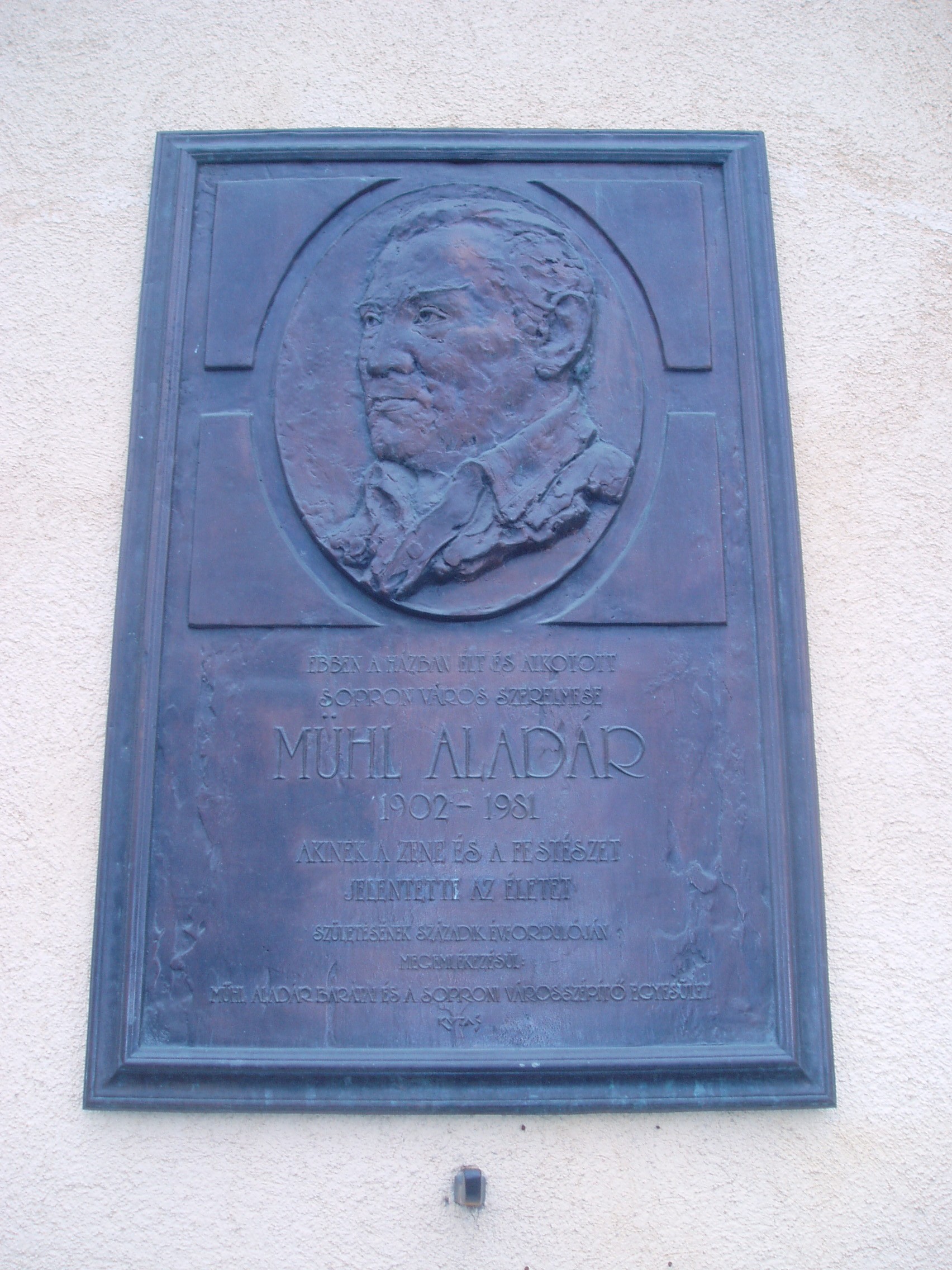 Nyilvános 868 | 1445 | Sopron, Bécsi út 20. | Emléktáblájának tanúsága szerint ebben a házban élt Mühl Aladár festőművész (1902-1981). Sopronban született, művészetre fogékony családban nevelkedett. 1920-ban az evangélikus líceumban érettségizett, majd tanítói oklevelet szerzett. Munka mellett végezte el a Zeneakadémiát, ahol Szőnyi Erzsébet tanítványa volt. A második diploma megszerzése után a soproni zeneiskolában szolfézst és zongorát tanított. A bohém hírében álló Mühl egész életében elkötelezett közéleti ember volt: ő szervezte meg Sopronban a Kodály Zoltán módszerét követő zenei általános iskolát. Évente nyári művésztelepet szervezett, Sopronba csábítva számos kiváló művészegyéniséget. A festő Mühlnek örök szerelme volt Sopron. Első kiállításával 1926-ban mutatkozott be szülővárosában, ezt újabb önálló tárlatok követték 1935-ben, 1949-ben, 1971-ben és 1976-ban Sopronban, Győrben és Németországban is. 1977-ben Lackner emlékéremmel jutalmazták. A fénykép 2008 júniusában készült. Felh. irod.: http://cyberpress.sopron.hu/article.php?id=9735 |