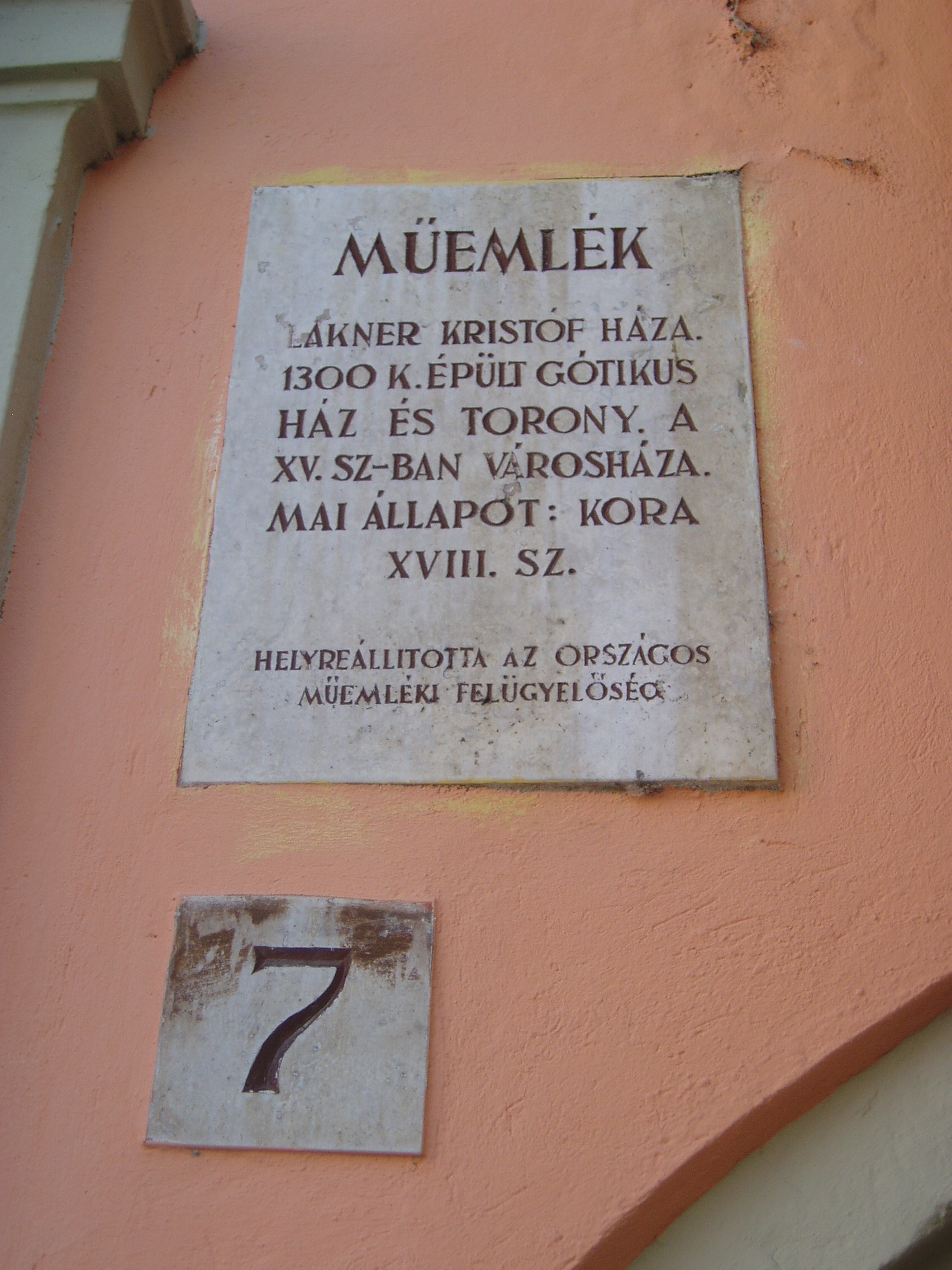 Nyilvános 840 | 1198 | Fő tér 7. Lackner-ház vagy Tábornok-ház | Udvari, keleti szárnya és a toronyhoz csatlakozó háromszintes rész a XV. században épült. A XVII. század elején a legendás polgármester, Lackner Kristóf tulajdona volt. Ebből az időből származhat főhomlokzata. 1631-ben bekövetkezett halálával Lackner kívánságára a városra szállt, azóta is többször átépítették, illetve tűzvész okozta károk után helyreállították. A főhomlokzat előtti klasszicista erkély 180-ból származik. Ide szállásolták el egykor Sopron katonai parancsnokait, másik nevét erről kapta. A kép 2008 júniusában készült. Felh.irod.: Czellár Katalin: Sopron. 3. jav. kiad. Bp. Panoráma, 2000 |