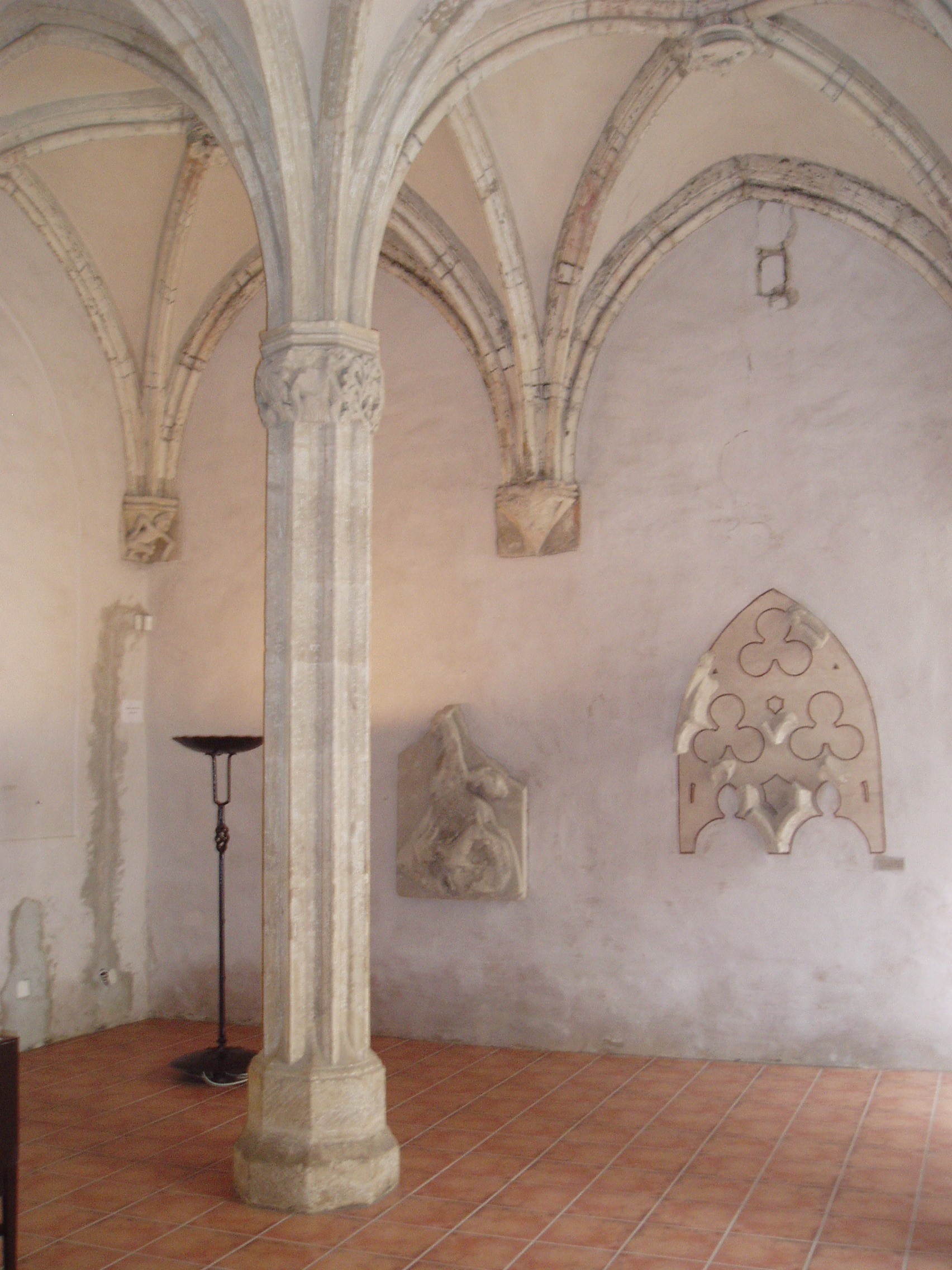 Nyilvános 698 | 1475 | Sopron, Fő tér: Kecske-templom - Káptalanterem | A Kecske–templomhoz a Templom utca felől kapcsolódik az egykori bencés rendház két udvart körülfogó, kétemeletes, nagy tömegű, de igénytelen külsejű épülete. A templommal együtt a ferencesek számára épült a XIV. században, majd 1802-ben a bencések kapták meg. E hajdani kolostor tartozéka a látogatók számára a templomból megközelíthető Káptalan–terem, Sopron város egyik legszebb gótikus műemléke. A háromhajós terem gótikus keresztboltozatait két karcsú nyolcszögletes pillér támasztja alá. A hajókhoz kelet felől egy–egy kápolnaszerű bővület csatlakozik, amelyeket pilléreken nyugvó csúcsíves árkád választ el a teremtől. A fénykép 2008 júniusában készült. Felh. irod.: Czellár Katalin: Sopron. 3. jav. kiad. Bp. Panoráma, 2000 |