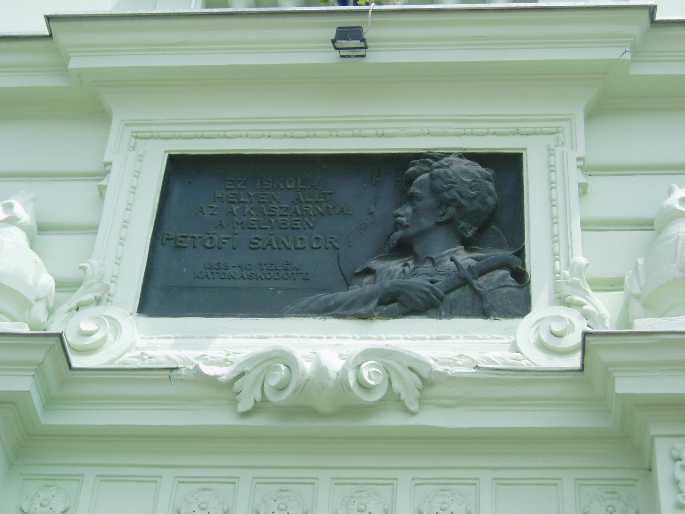 Nyilvános 791 | 1268 | Sopron, Halász utca 25. | A Petőfi Sándor Általános Iskola falán emléktábla hirdeti, hogy valaha helyén az a kaszárnya állt, amelyben 1839/40 telén katonáskodott Petőfi Sándor. A fénykép 2008 júniusában készült. |