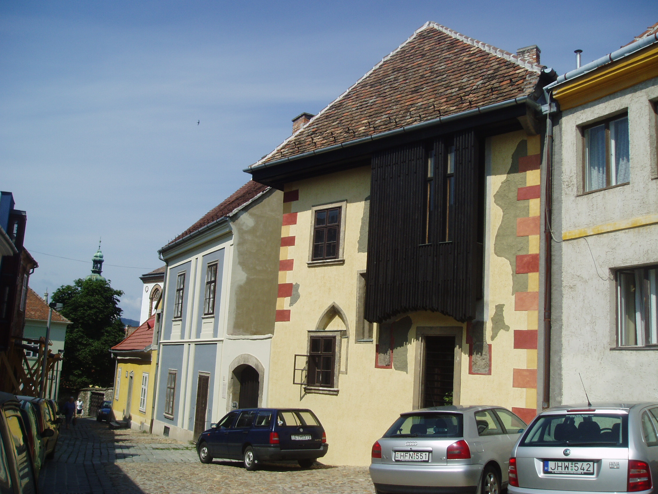 Nyilvános 750 | 1227 | Sopron, Szent Mihály utca 3. | Az egyemeletes épület voltaképpen két lakóház, amelyeket kapuval áttört kerítésfal tart össze. Az északi ház, amelynek sarkain színes kváderezés látható, a XIV. század közepén épülhetett, utcai homlokzatán felismerhetők a gótika jellemzői. A bal oldali épületrész homlokata XIX. századi jellemzőket mutat, udvari része azonban középkori elemeket is őriz. Ennek utcára néző földszinti szobájában maradt meg Magyarország legkorábbi, 1460-ban készült fafödéme. A kép 2008 júniusában készült. Felh. irod.: Czellár Katalin: Sopron. 3. jav. kiad. Bp. Panoráma, 2000 |