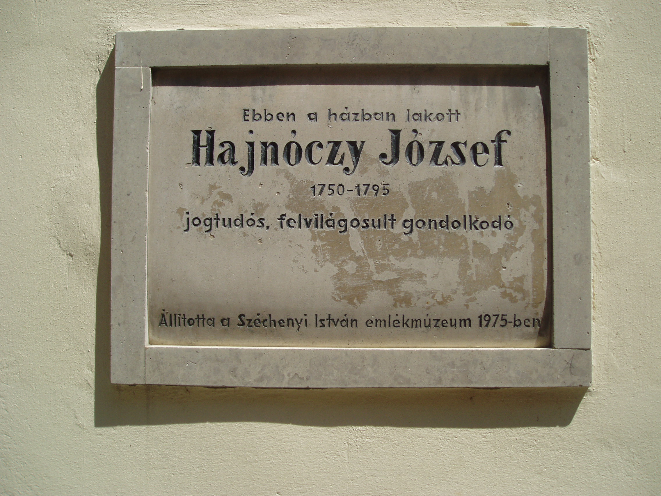 Nyilvános 775 | 1125 | Sopron, Templom utca 19. | Középkori eredetű, egyszerű, egyemeletes lakóház. 1734-ben Hajnóczy Dániel, a neves tanár és hitszónok tulajdona volt. Az épületen emléktábla hirdeti, hogy ebben a házban lakott Hajnóczy József (1750-1795) jogtudós, felvilágosult gondolkodó. Apja Hajnóczy Sámuel evangélikus lelkész volt. Hajnóczy részt vett a Martinovics-féle összeesküvésben, amiért Budán lefejezték. A kép 2008 júniusában készült. Felh. irod.: Czellár Katalin: Sopron. 3. jav. kiad. Bp. Panoráma, 2000 |