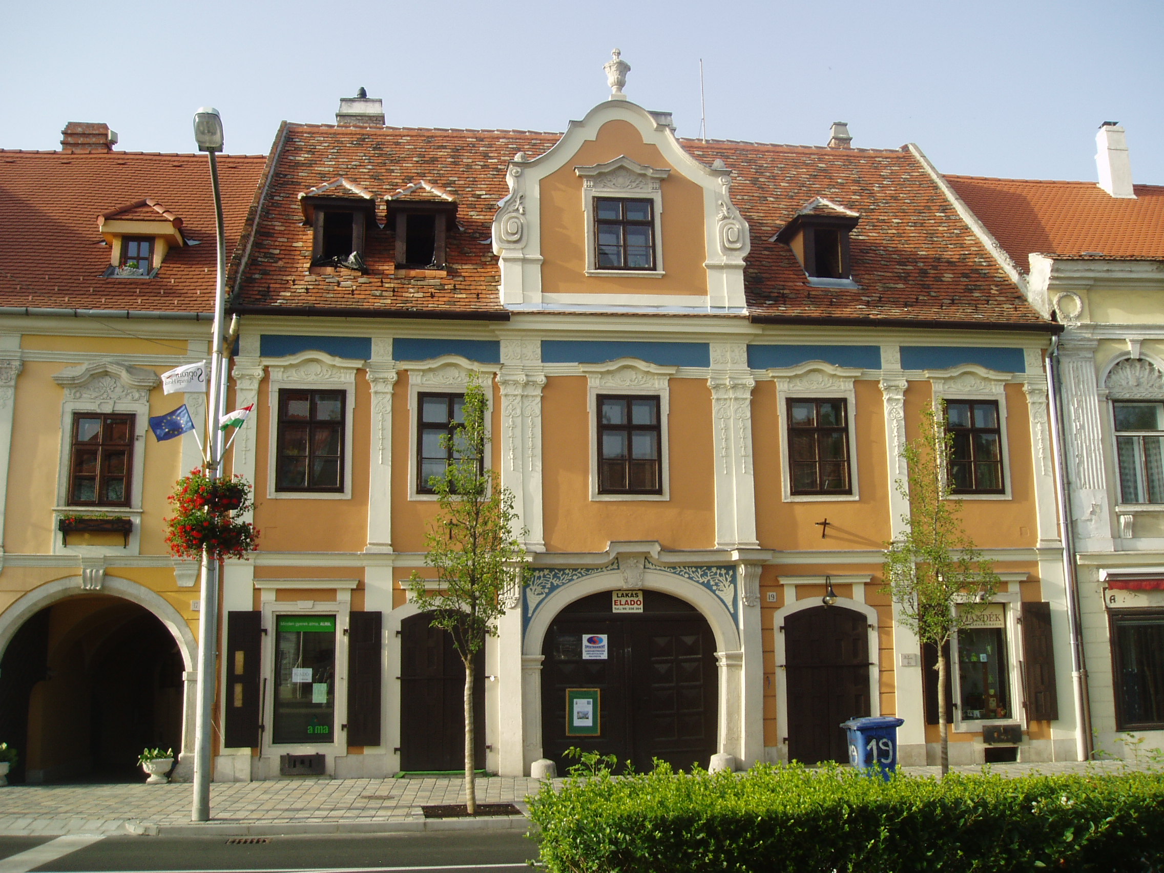 Nyilvános 754 | 1129 | Sopron, Várkerület 19. | Az épület telkén haladt át egykor a római Borostyánkő út. A rokokó homlokzatú ház már a középkorban is állt: ez volt a Kovács utcai fürdőház, amelyet ekkor a ferencesek birtokoltak. Később a városé lett és Freyse András fürdős 1682-ben megvásárolta. 1767-ben akkori tulajdonosa, Linberger György kereskedő átépítette, de a fürdő valószínűleg csak 1830 körül szűnt meg. Az épület kapujának zárókövén Linberger monogramja és az 1757-es évszám olvasható. A kép 2008 júniusában készült. Felh. irod.: Czellár Katalin: Sopron. 3. jav. kiad. Bp. Panoráma, 2000 |